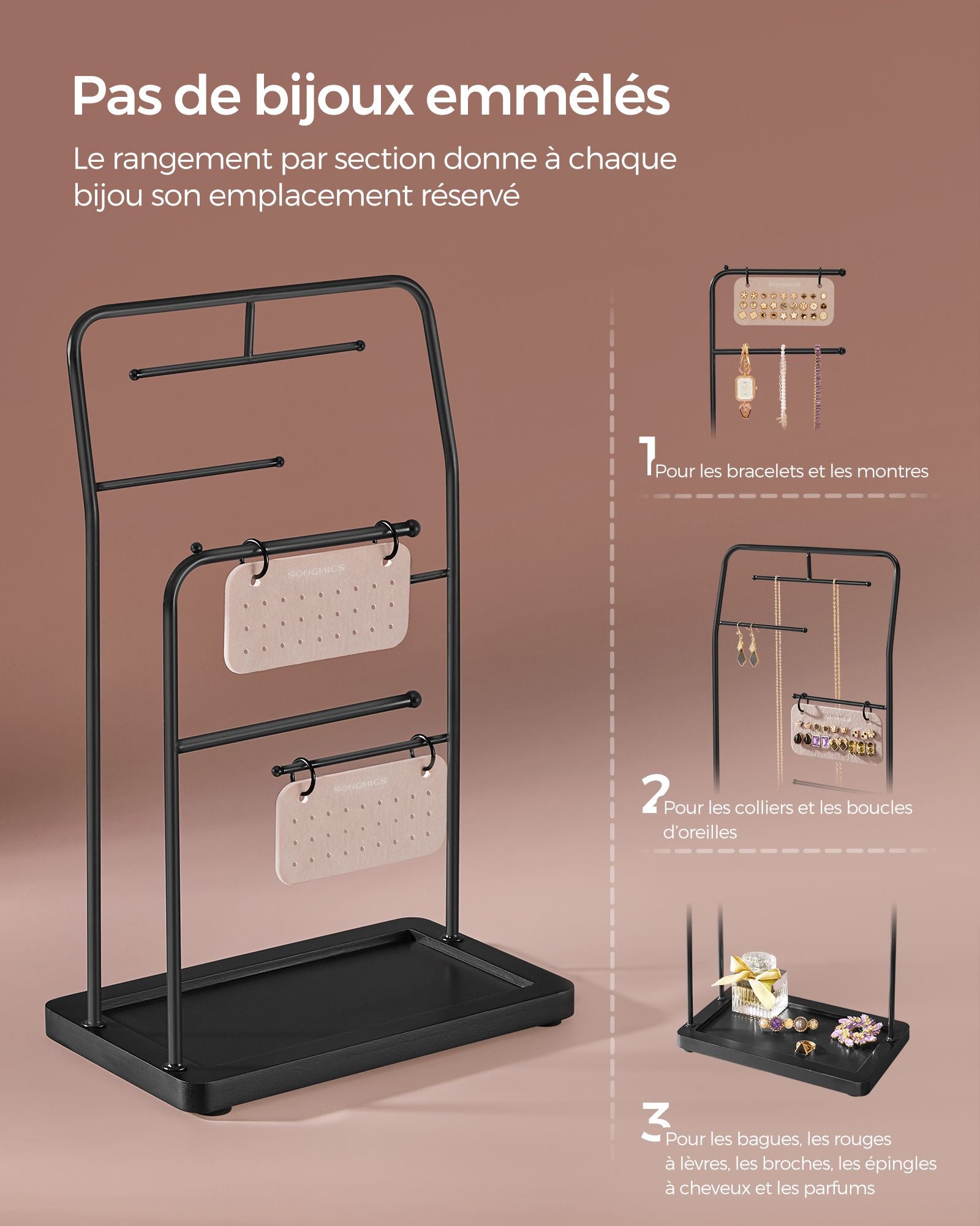 Pensé pour un rangement clair et ordonné, il propose plusieurs sections distinctes : deux plaques pour présenter vos boucles d’oreilles, quatre tiges de différentes hauteurs pour suspendre colliers et bracelets, ainsi qu’un plateau inférieur idéal pour bagues, montres ou autres petits accessoires.