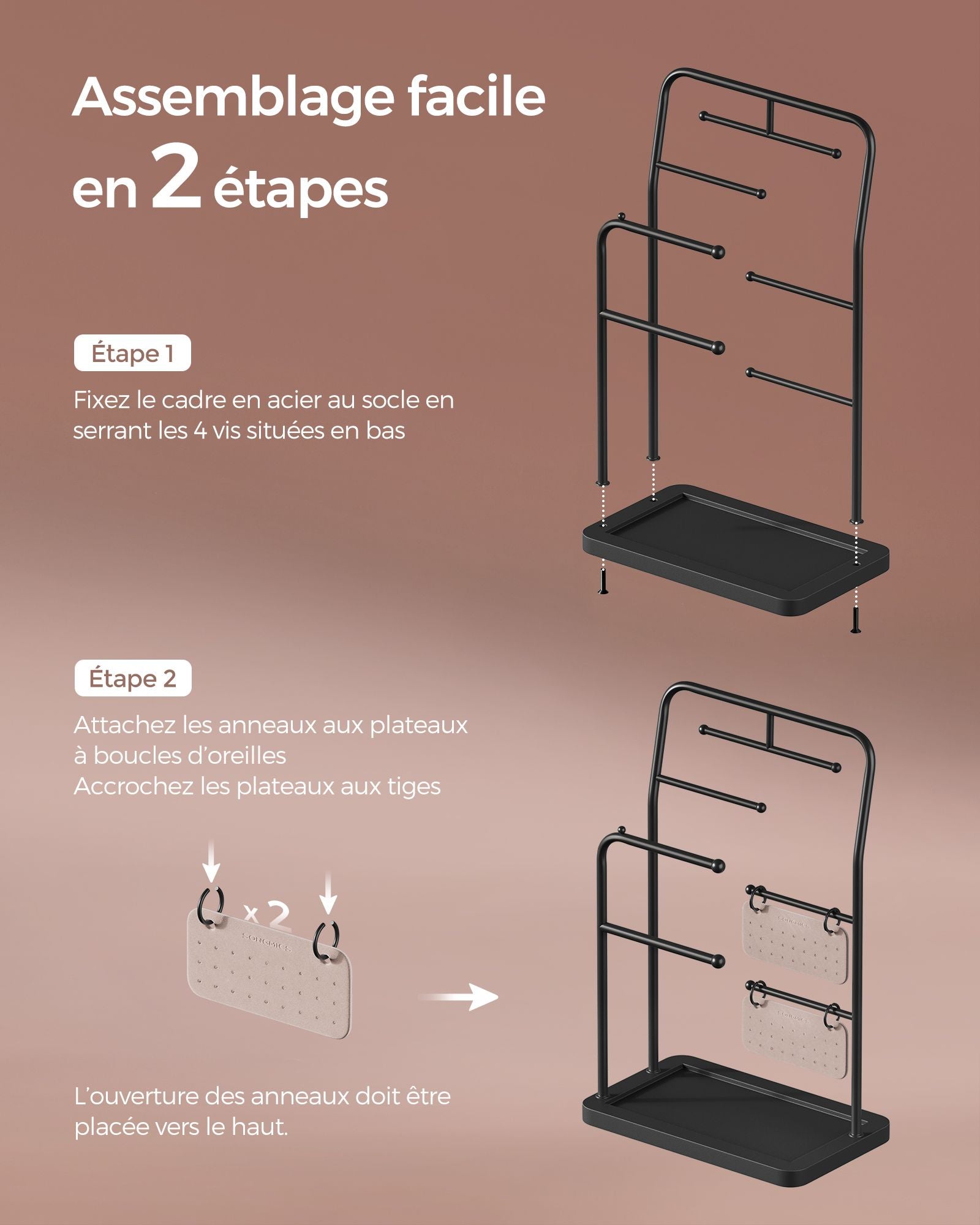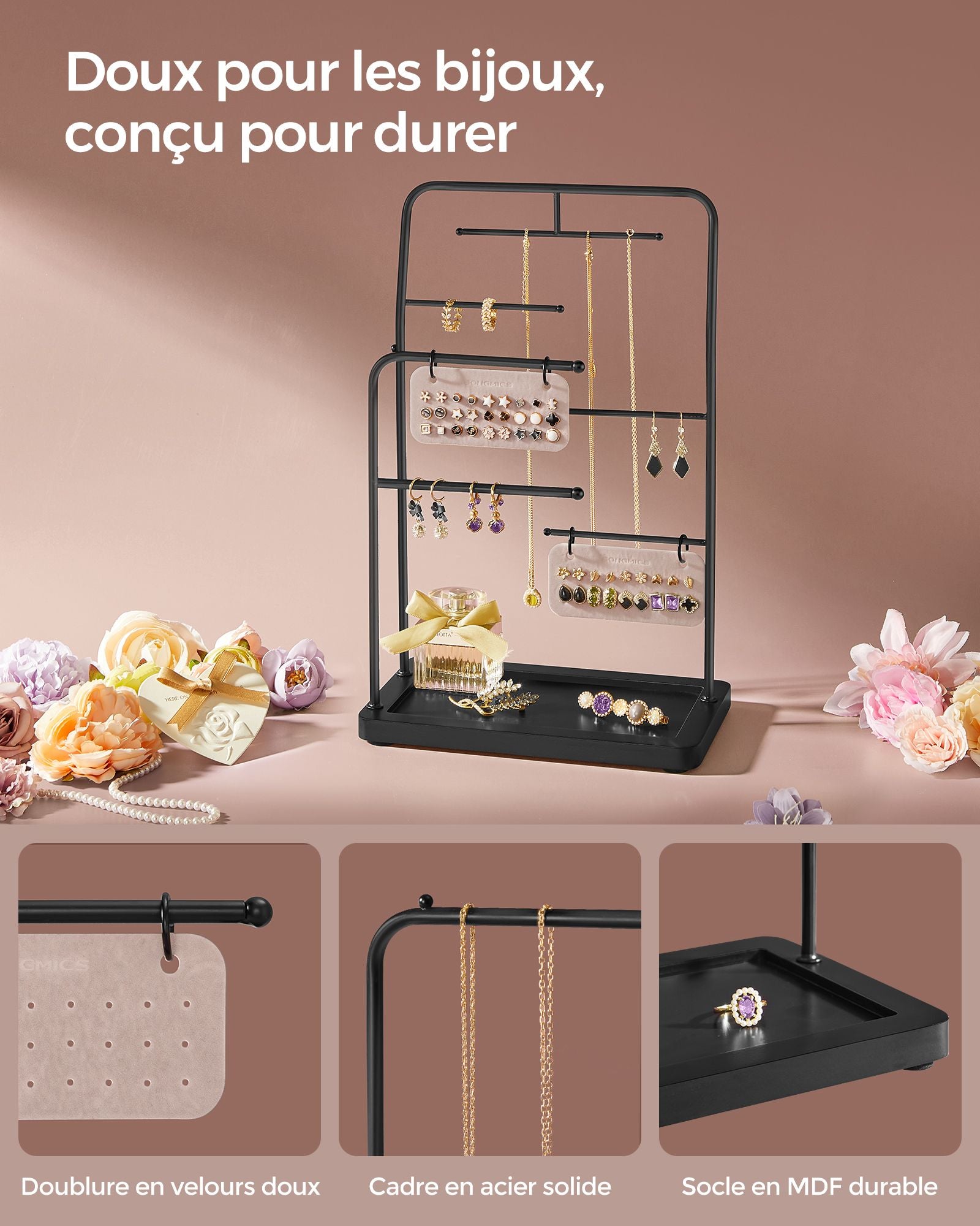 Solide et stable, il est fabriqué en acier résistant et renforcé par une base en MDF durable, ce qui assure un bon maintien et protège vos bijoux des chocs accidentels.