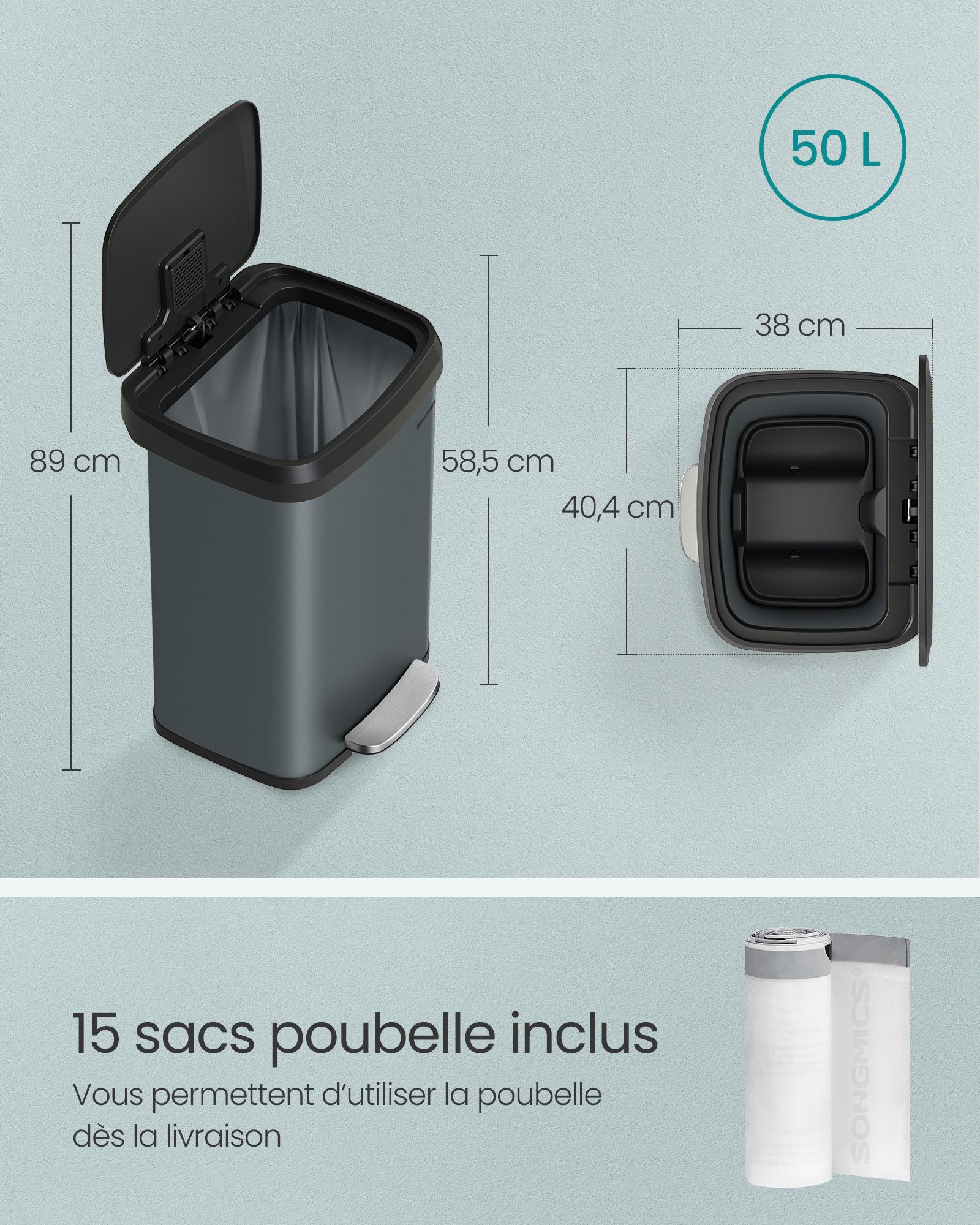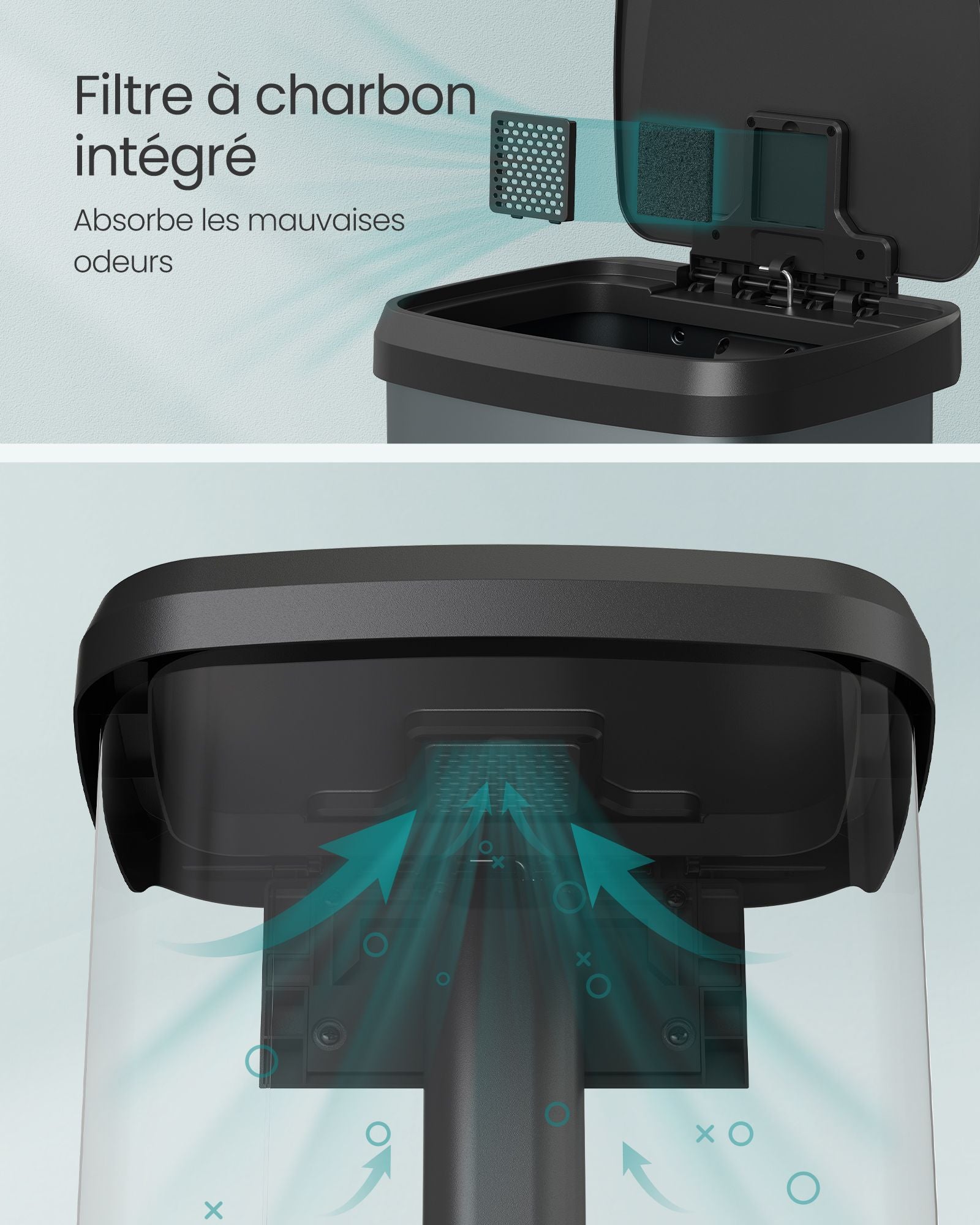 Un filtre à charbon intégré dans le couvercle neutralise les mauvaises odeurs pour garder votre cuisine toujours fraîche. De plus, 15 sacs poubelle adaptés (45-55 L) sont inclus pour une utilisation immédiate.