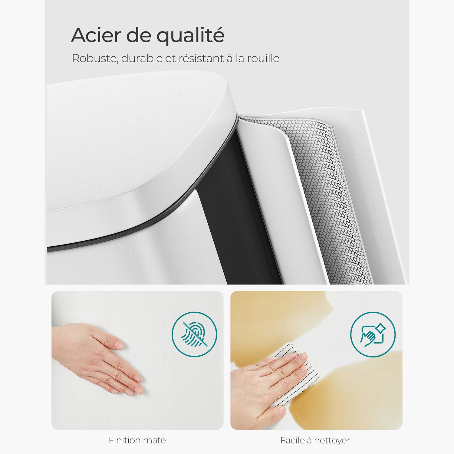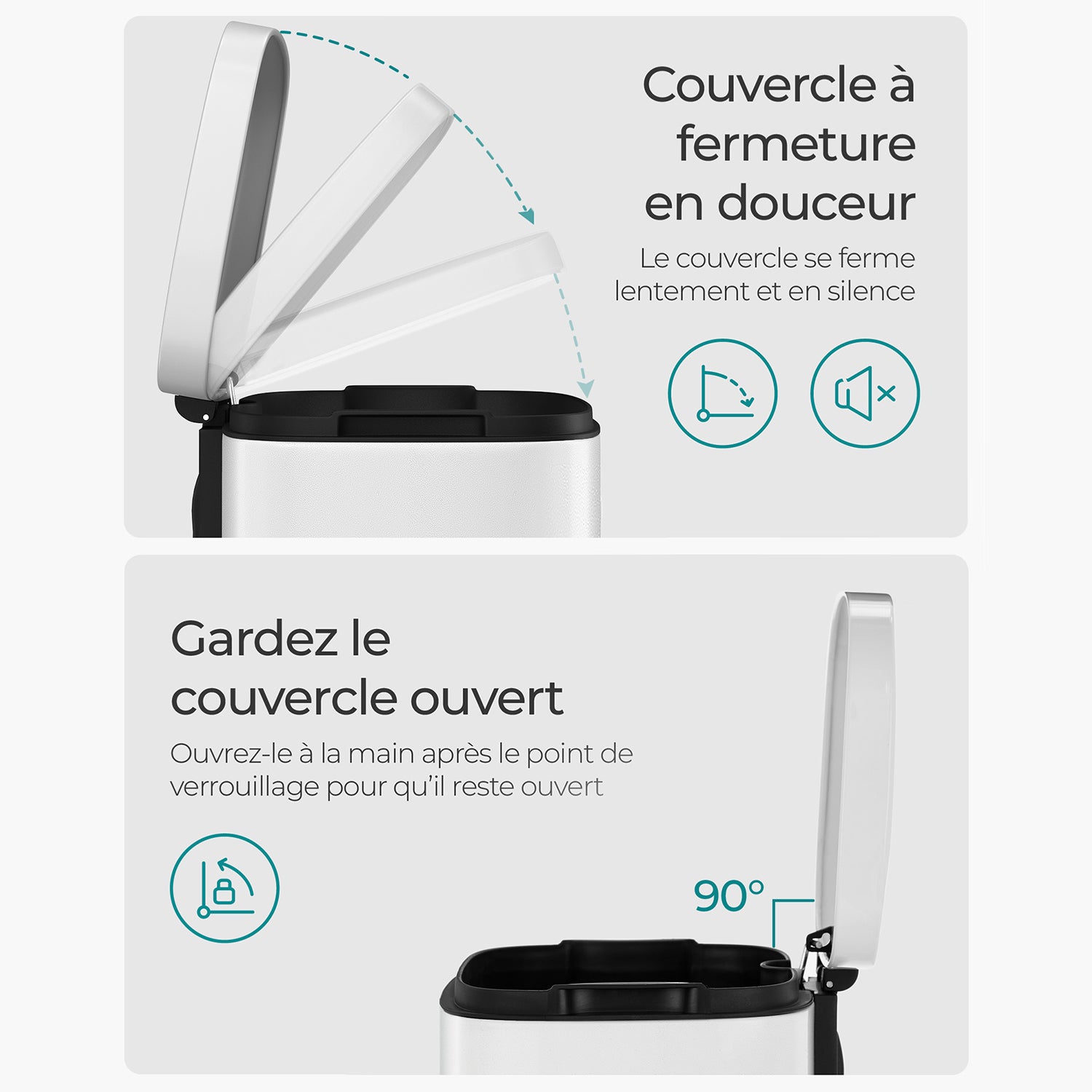 Le couvercle à fermeture douce et silencieuse empêche les odeurs de se propager grâce à un joint étanche. Son système à pédale permet une ouverture sans contact, garantissant une utilisation hygiénique au quotidien. Vous pouvez également l’ouvrir à la main jusqu’au point de verrouillage pour qu’il reste ouvert si nécessaire.