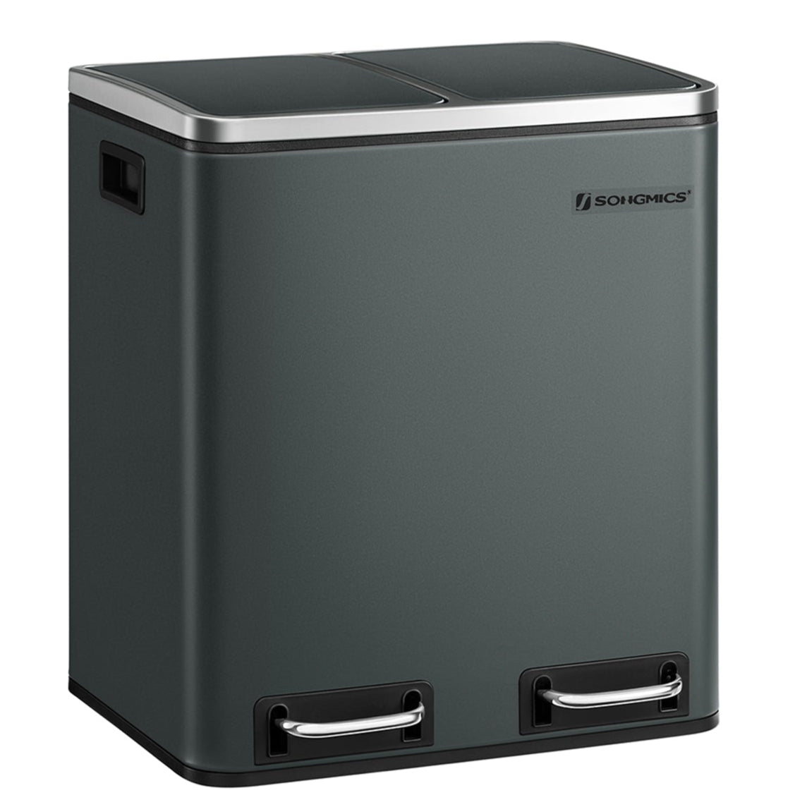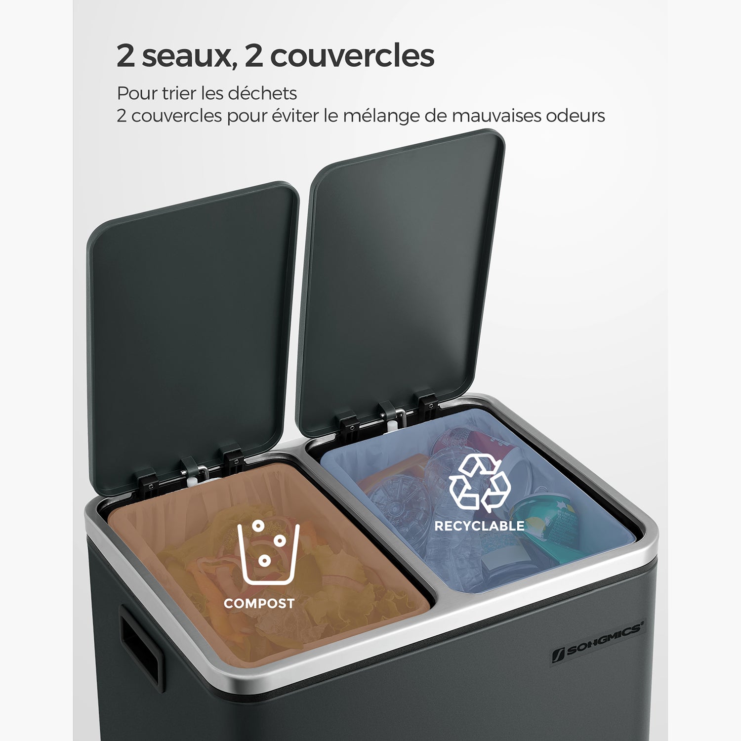 Poubelle en métal 30l poubelle à double compartiment 2 x 15 litres avec seaux intérieurs et poignées fermeture en douceur hermétique gris 12_0007269