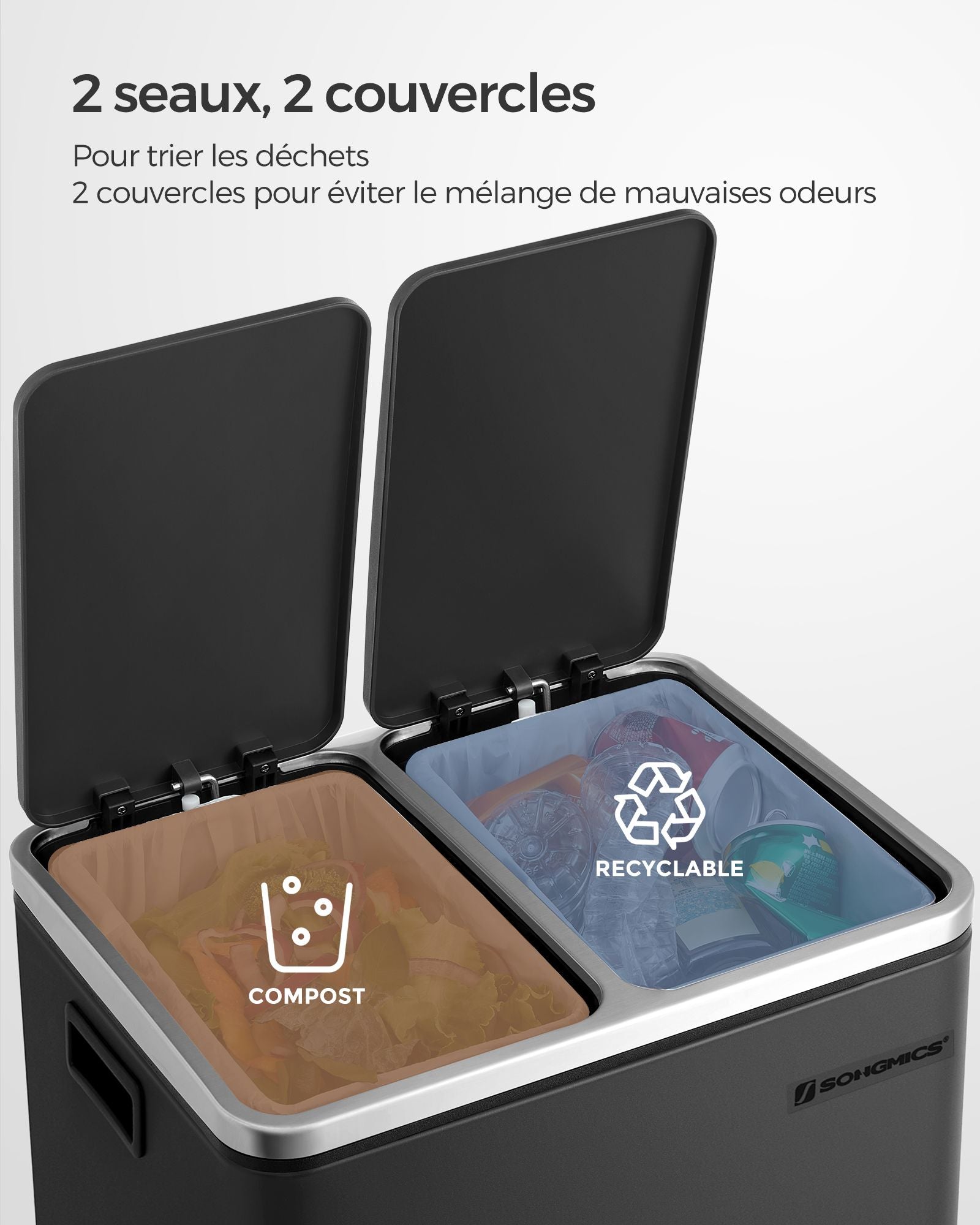 Grâce à ses deux compartiments, le tri devient simple et rapide. Chaque partie est équipée d’une pédale, ce qui permet d’ouvrir les couvercles sans les toucher, garantissant ainsi une utilisation hygiénique et confortable.