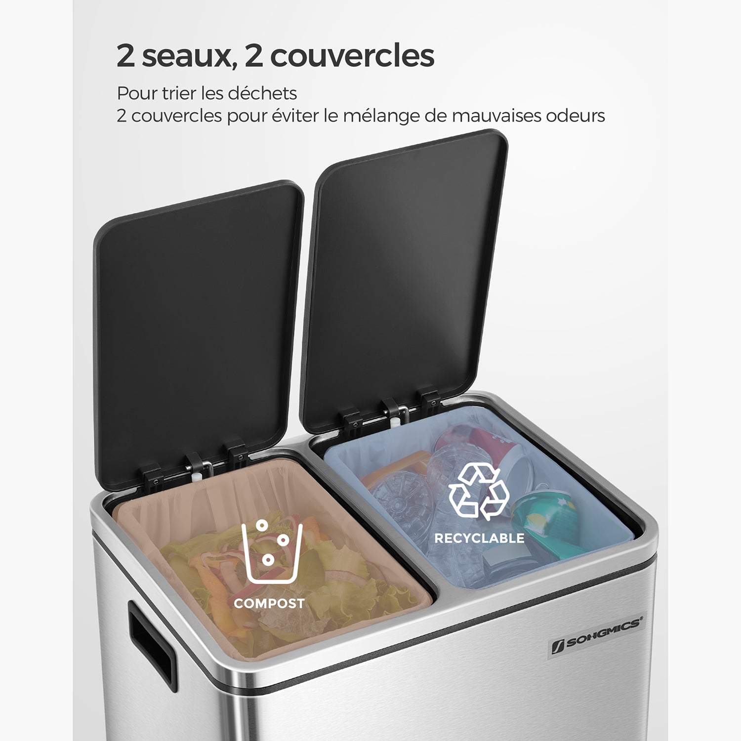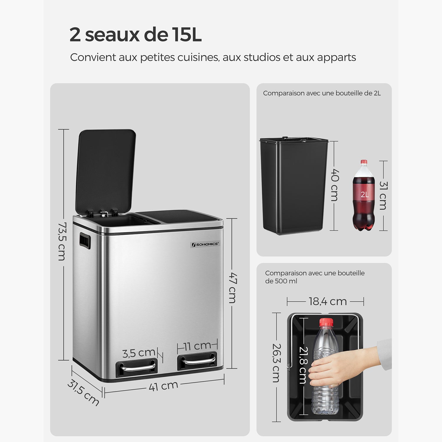 Dotée de 2 compartiments de 15 L chacun, elle facilite le tri sélectif au quotidien. Grâce à ses pédales, vous n’avez même pas besoin de la toucher pour jeter vos déchets, ce qui rend son utilisation hygiénique et pratique.