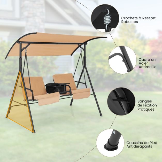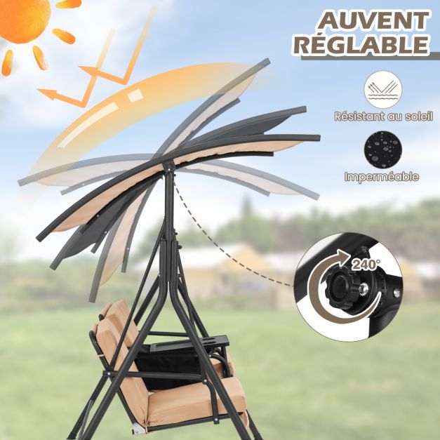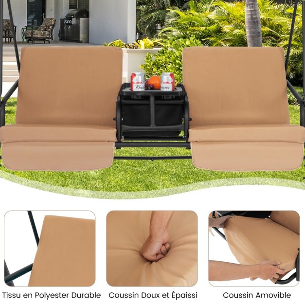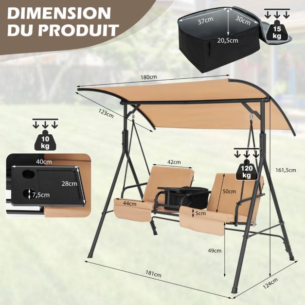 Balançoire de porche avec auvent réglable balancelle pour 2 personnes sac isotherme plateau rotatif coussins amovibles marron 20_0007766