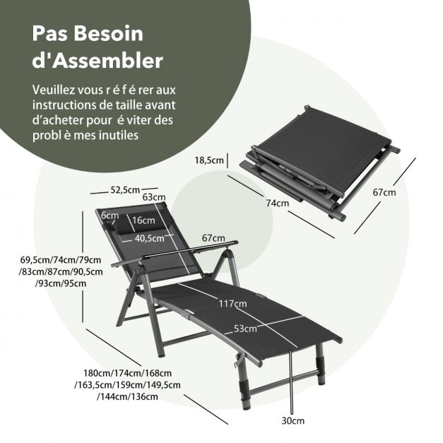 Dimensions hors tout chaise dépliée : 180/174/168/163,5/159/149,5/144/136 x 67 x 69,5/74/79/83/87/90,5/93/95 cm (L x l x H)