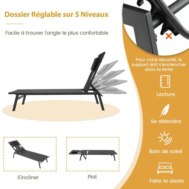 Chaise longue d'extérieur en fer avec 1 face et 2 trous latéraux 5 positions de dossier appui-tête amovible 150 kg noir 20_0005013