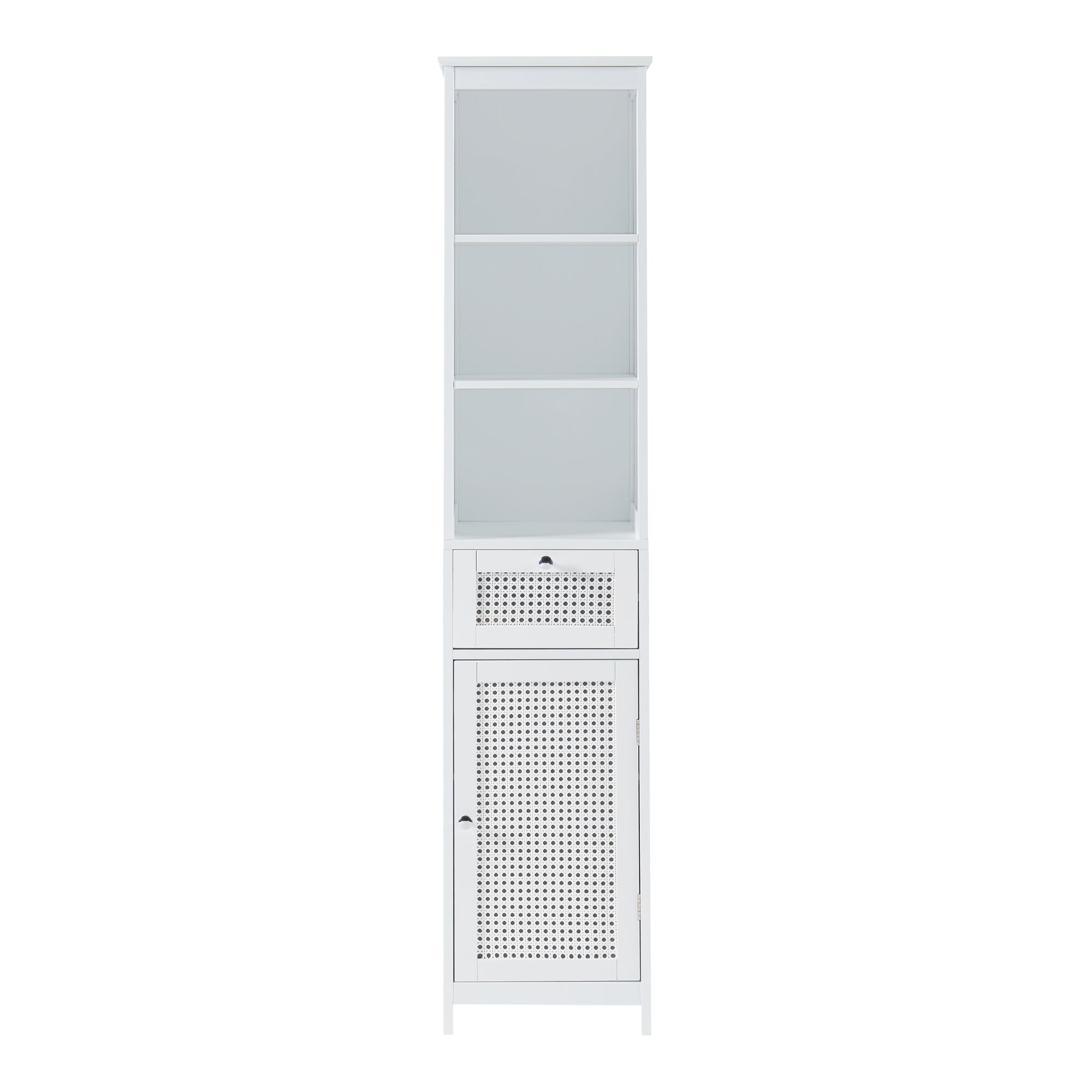 Notre armoire haute de salle de bain représente la solution idéale pour organiser votre espace avec élégance tout en offrant un rangement supplémentaire. Dotée d'une porte et d'un tiroir qui s'ouvrent et se ferment aisément, vous pouvez accéder facilement à vos ustensiles de bain. Les compartiments de rangement ouverts en haut du meuble permettent de stocker des serviettes, du papier toilette et des produits de nettoyage. À l'intérieur, deux étagères optimisent l'espace pour vos cosmétiques et autres objets essentiels. Son design intemporel lui permet de s'adapter à différents styles d'aménagement et de trouver sa place dans d'autres pièces selon vos besoins.