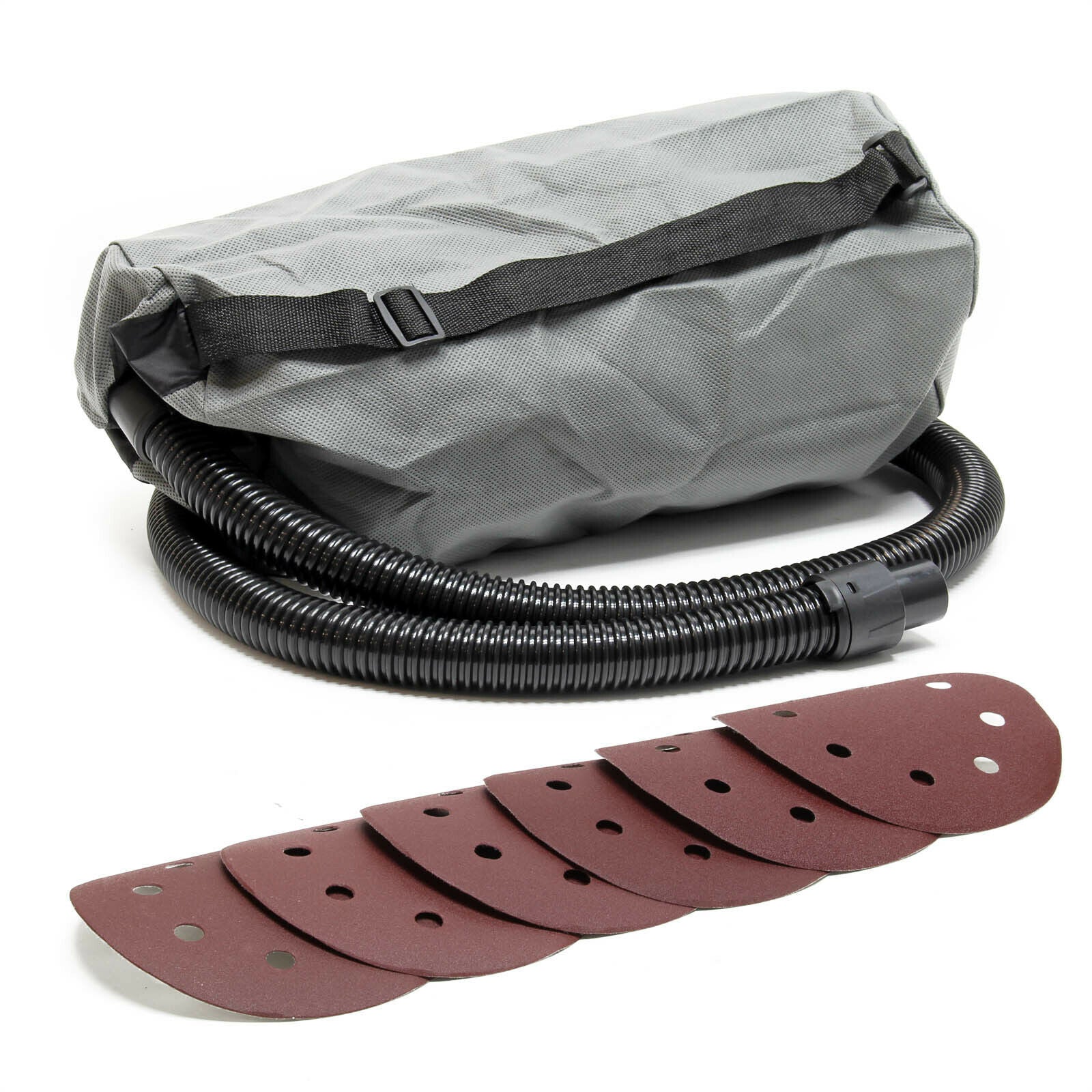 Vous recevrez la disqueuse avec les accessoires suivants, pour que vous puissiez entamer directement les travaux : 6 disques de ponçage, 2 balais de charbon, un tuyau d'extraction de 2 mètres de long, un sac à poussière, un adaptateur de raccordement et une clé Allen.