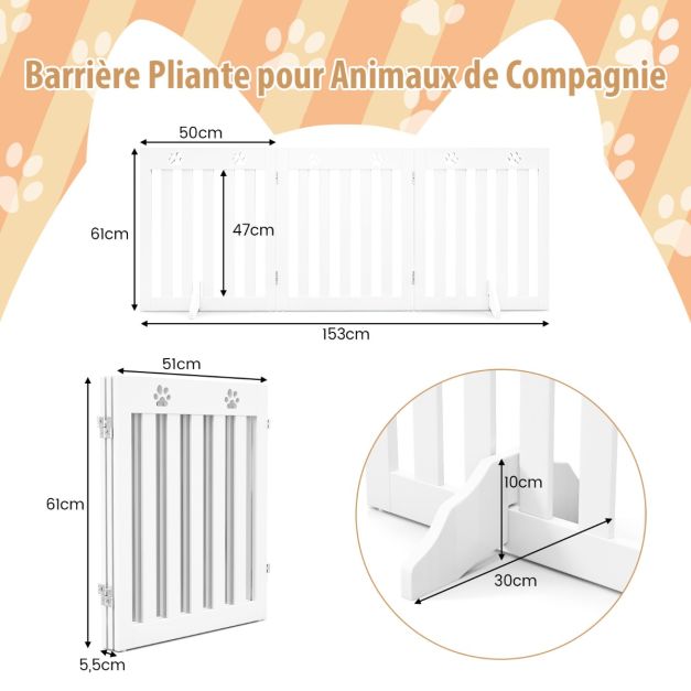 Barrière pliable pour animaux à 3 panneaux clôture de sécurité autoportante pour animaux 2 pieds amovibles pour escalier porte et cuisine blanc 20_0005225