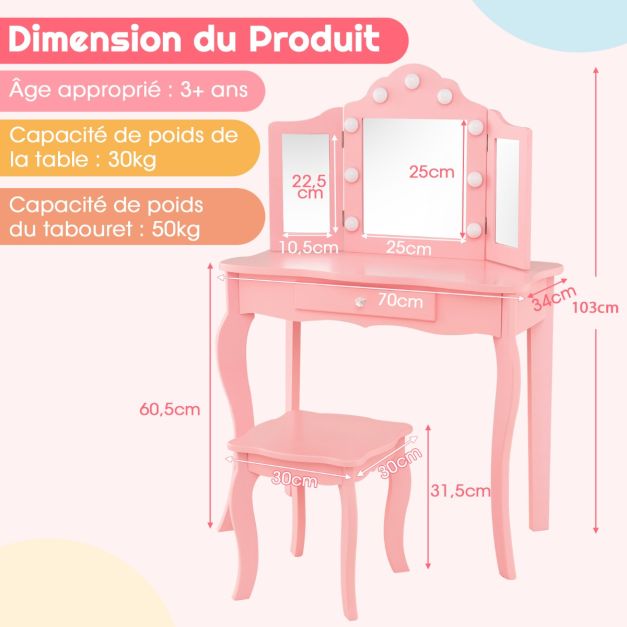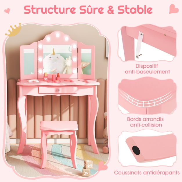Ensemble de coiffeuse et tabouret pour enfants maquillage 2 en 1 avec miroir pliant en verre véritable et tiroir ensemble de coiffeuse rose 20_0008472
