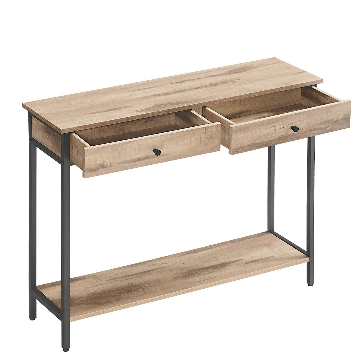 Fonctionnelle, elle dispose de deux tiroirs placés sous le plateau principal, parfaits pour ranger vos clés, votre courrier ou vos petits objets du quotidien. Fini le désordre : tout reste à portée de main, mais bien dissimulé.