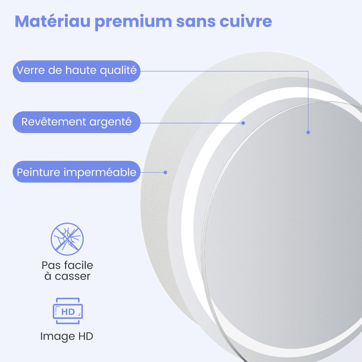 Miroir mural rond à led et fonction anti-buée miroir de courtoisie étanche avec 3 couleurs 58 lumières écran tactile miroir de maquillage argent 20_0008919