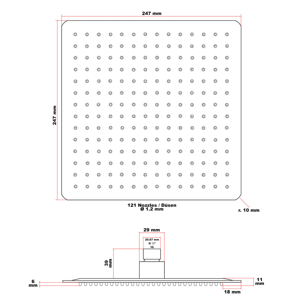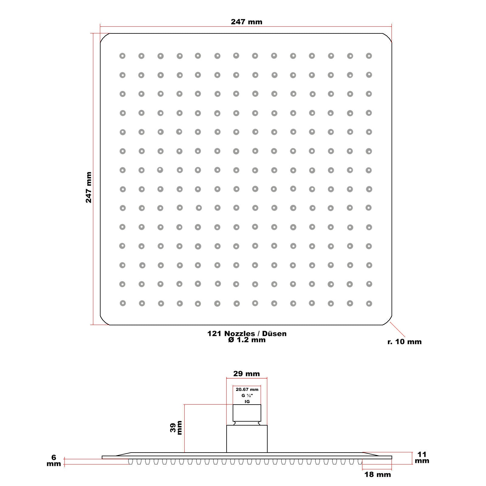 Pommeau de douche carré pomme jet de pluie tête douche 25 x 25 cm acier inoxydable 16_0000626