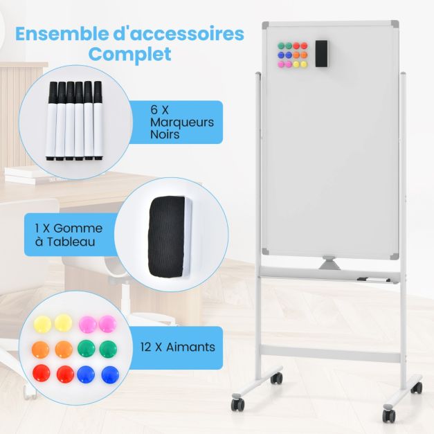 Tableau blanc mobile magnétique double face tableau réversible effaçable à sec hauteur réglable sur 2 positions 4 roulettes pour école blanc 20_0009471