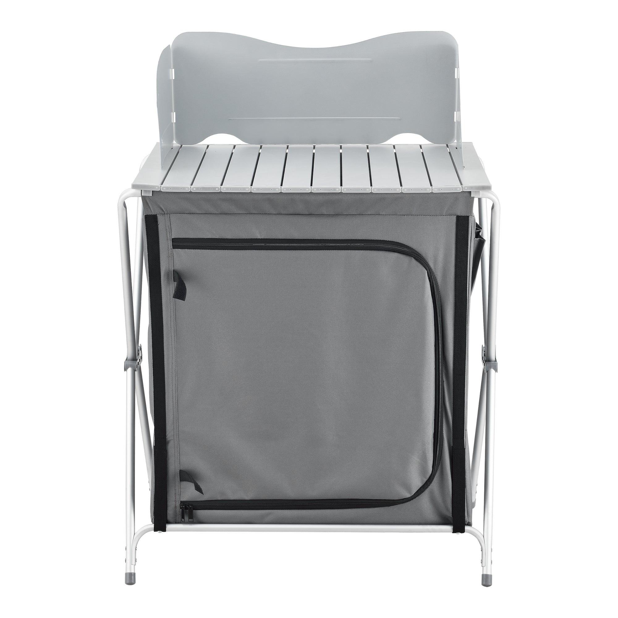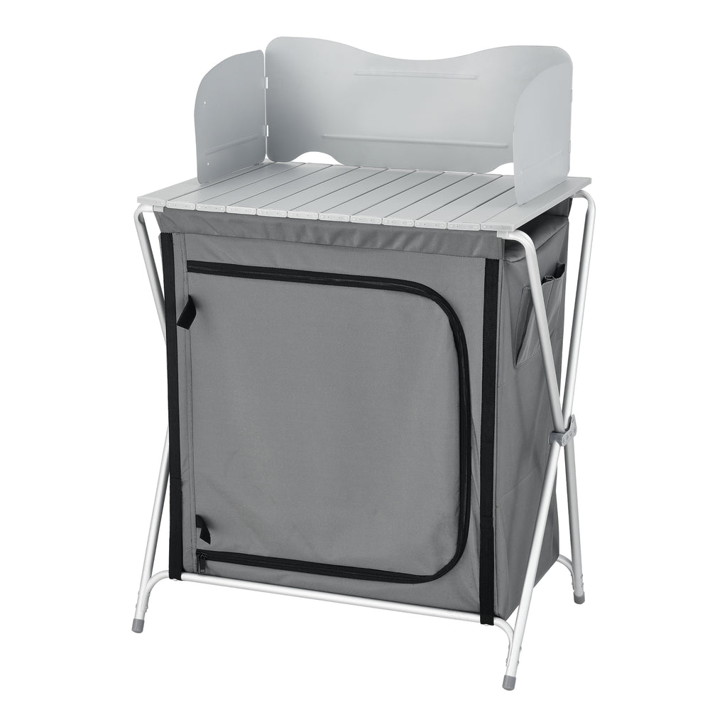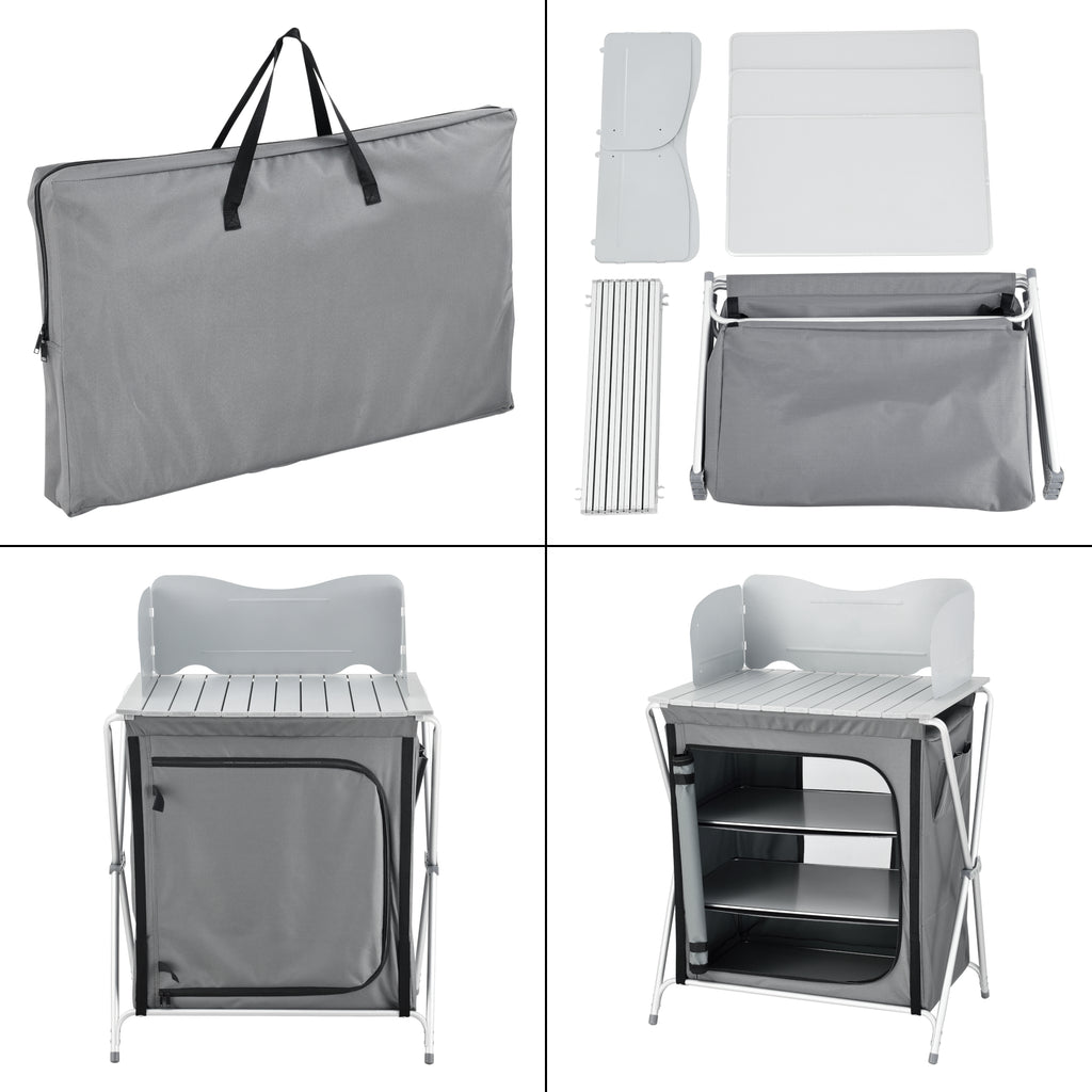 Ce meuble de cuisine d'extérieur permet un usage polyvalent et se range facilement grâce au sac de transport et à son caractère pliable. Le plan de travail vous offre une surface pratique pour les préparatifs. Quant à l'intérieur, les compartiments fermés permettent de ranger vos outils, assiettes et verres.