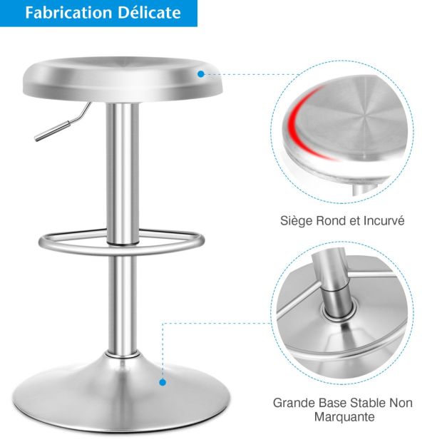 Tabouret de bar rond et pivotant avec repose-pieds hauteur réglable base non marquante tabouret à hauteur de comptoir argent 20_0009482
