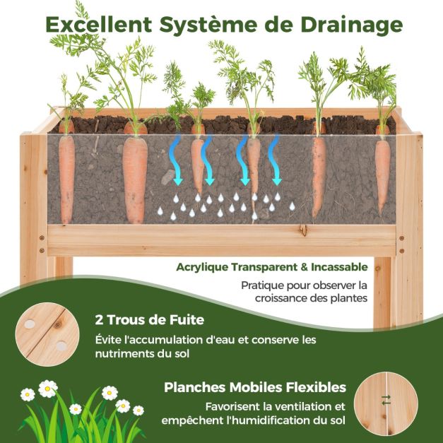 Jardinière surélevée en bois trous de drainage panneaux acryliques transparent légumes herbes fleurs capacité de 130 litres naturel 20_0008642