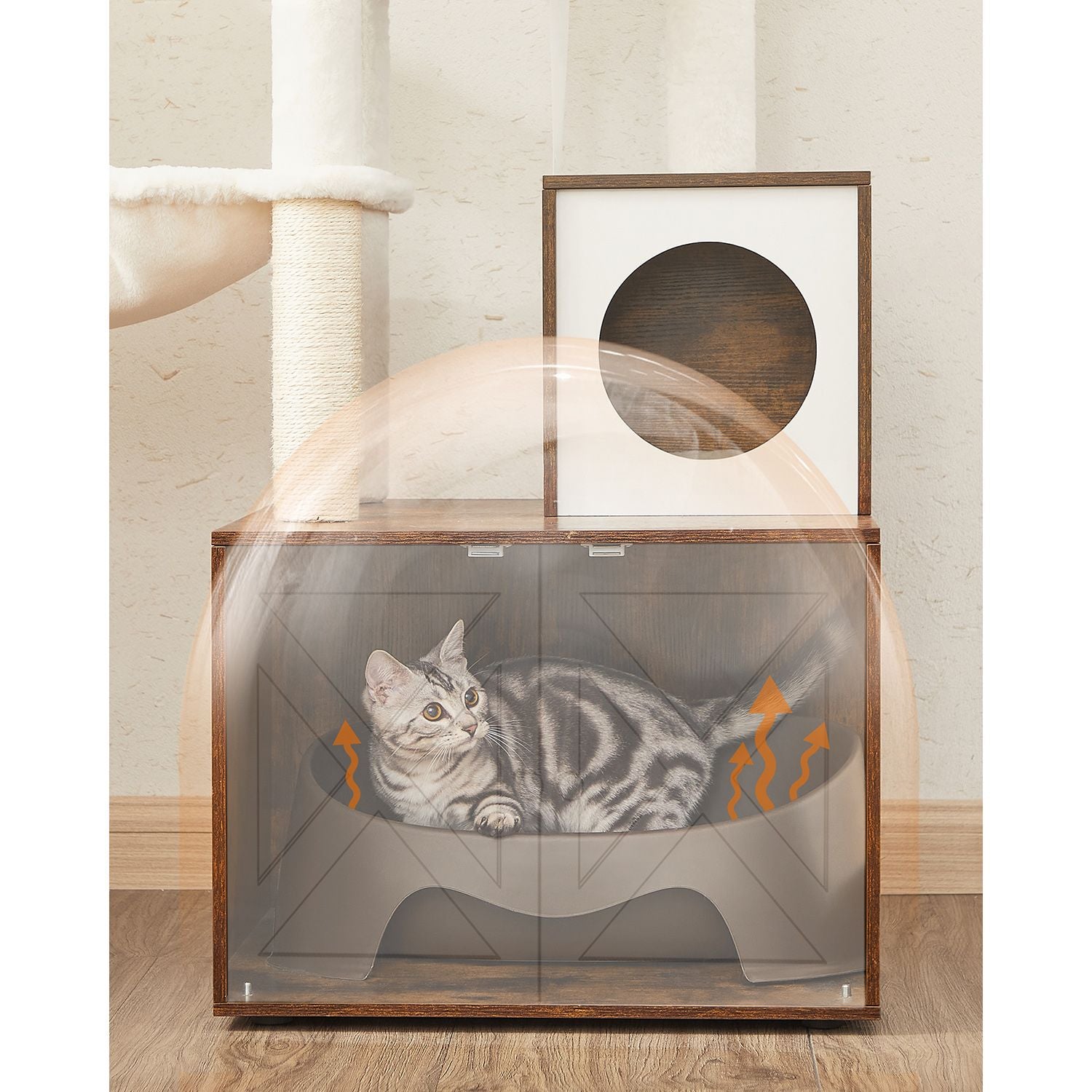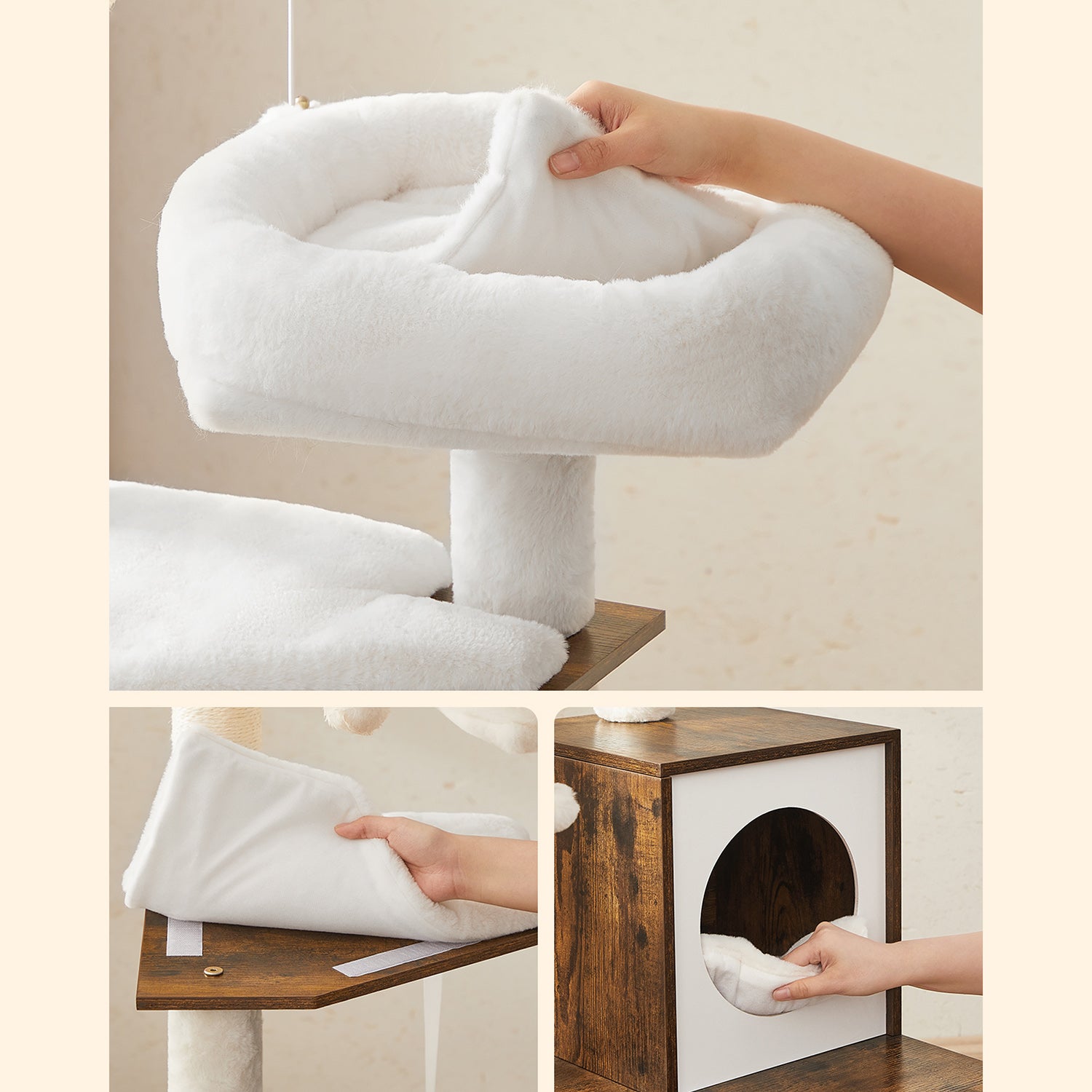 Cet arbre à chat 2-en-1 combine un espace de jeu et de repos avec un cache-litière pratique, tout en occupant seulement 57,5 x 50 cm au sol. Il offre à vos chats un lieu unique pour observer, grimper, se détendre et faire leurs besoins, tout en gardant votre intérieur bien rangé.