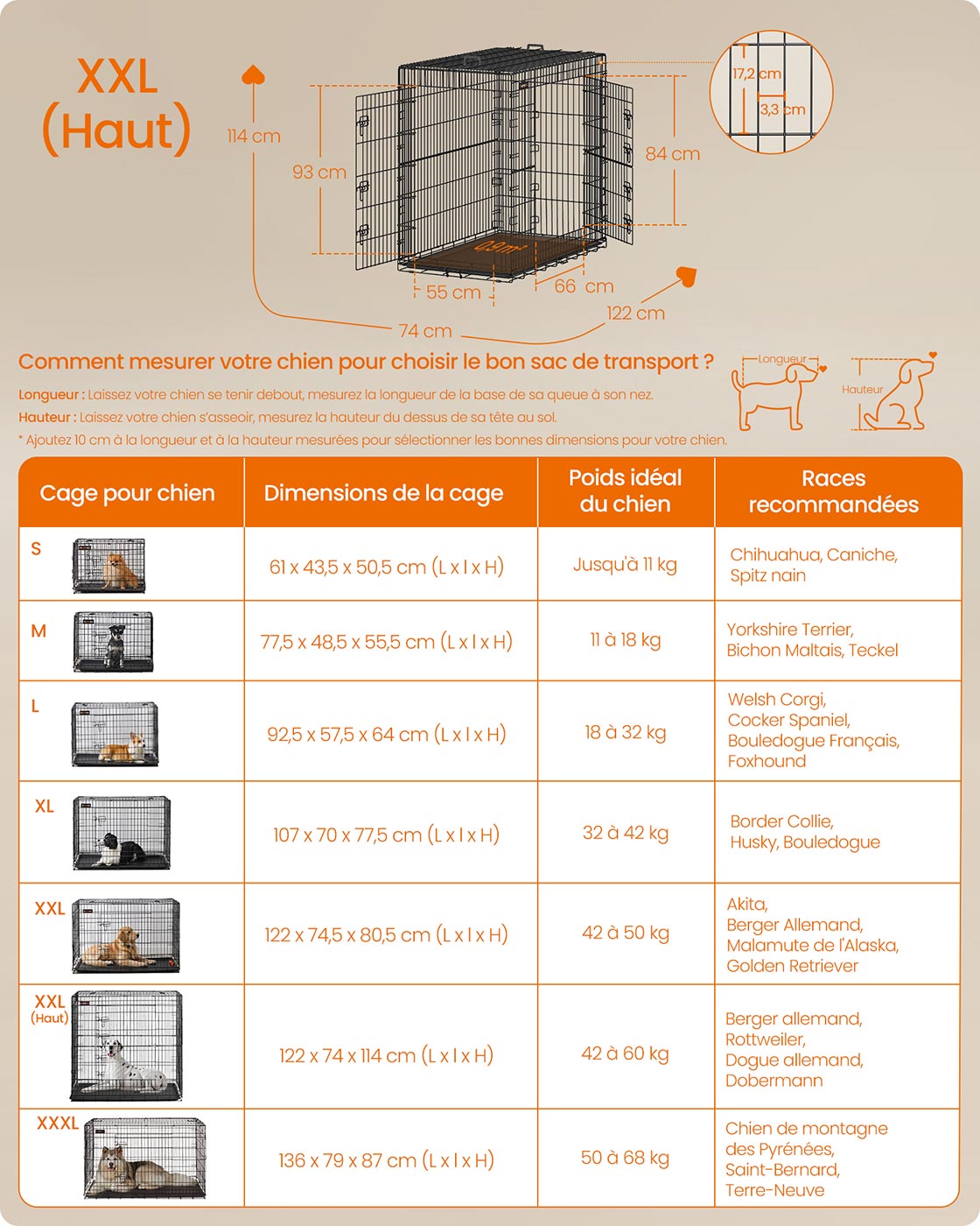 Avec ses dimensions de 122 x 74 x 114 cm, cette cage convient aux chiens pesant entre 42 et 60 kg. Les races recommandées incluent le berger allemand, le rottweiler et le grand danois. Veuillez consulter nos conseils de mesure dans les précautions afin de choisir la taille adaptée à votre chien.