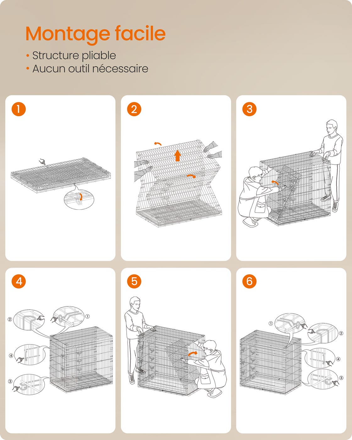 Aucun outil n’est nécessaire pour l’assemblage, il suffit de fixer les verrous. La cage est pliable et, grâce à ses deux poignées situées sur le dessus, elle est facile à transporter.