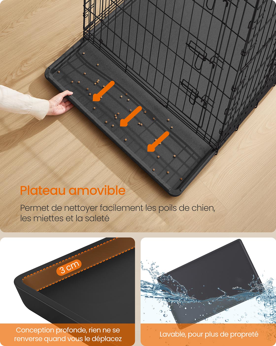Elle est équipée d’un plateau en plastique amovible, ce qui la rend simple à nettoyer. Votre chien profitera ainsi d’un espace propre et agréable.