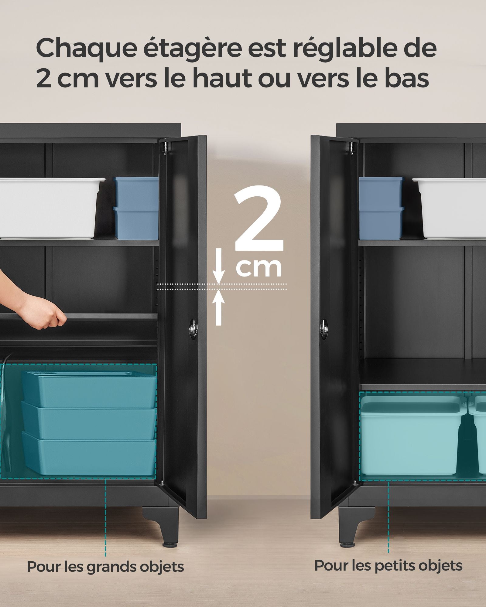 Avec son design sobre et sa couleur noire intemporelle, ce meuble en métal s’intègre facilement dans différents espaces de la maison. Que ce soit au bureau pour classer vos dossiers, dans la cuisine pour organiser vos ustensiles ou dans le garage pour ranger outils et accessoires de sport, il se révèle aussi polyvalent que pratique.