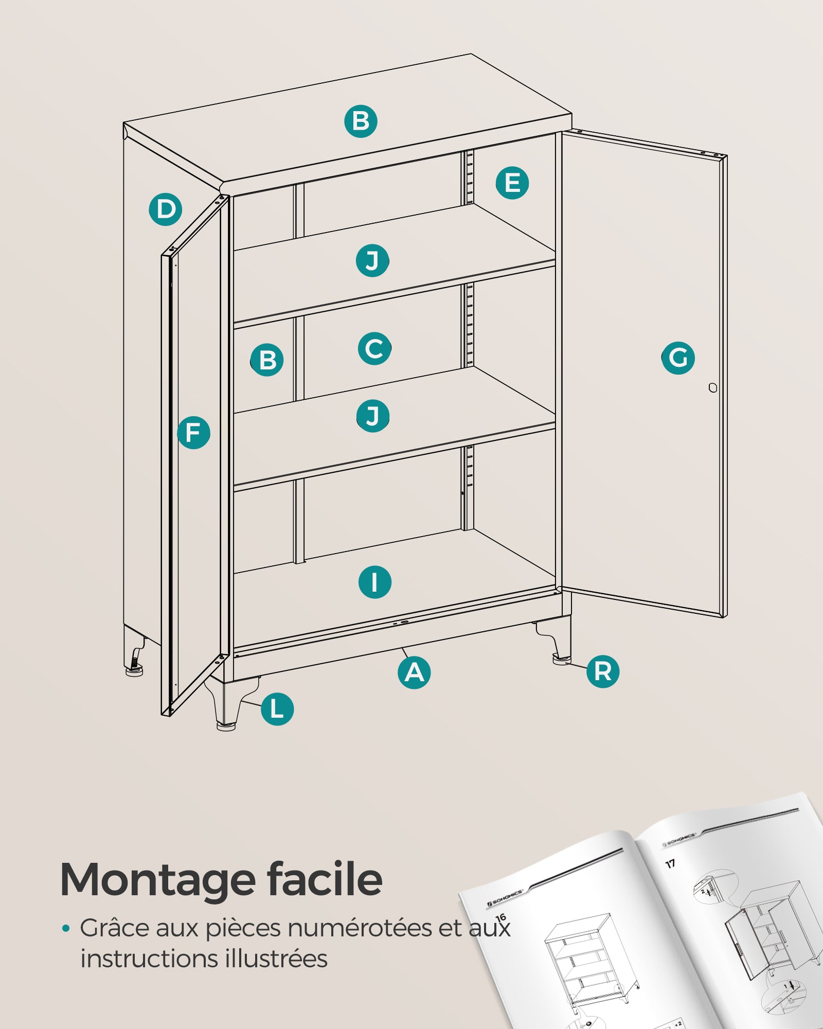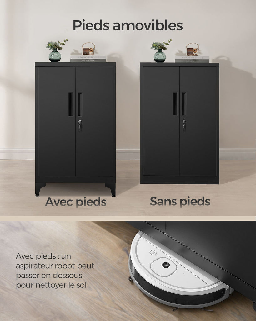 Équipé d’une serrure en métal de qualité avec deux clés, il assure la sécurité de vos affaires personnelles. Les pieds réglables, que vous pouvez choisir de monter ou non, garantissent une bonne stabilité même sur un sol légèrement irrégulier.
