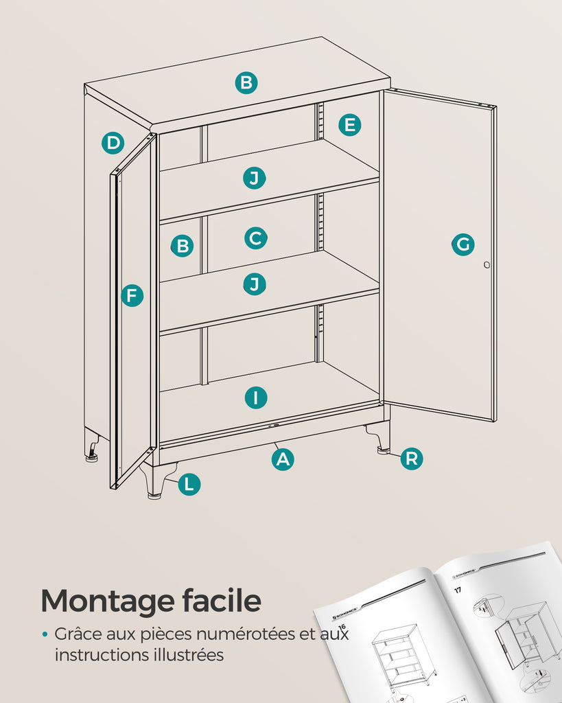 Fabriqué en acier traité par poudrage, ce placard est robuste, résistant à la rouille et conçu pour durer. Sa surface, résistante à l’eau et facile à nettoyer, conserve son aspect soigné au fil du temps.
