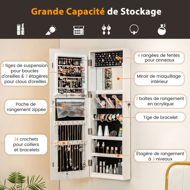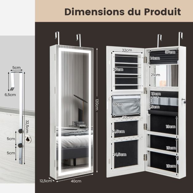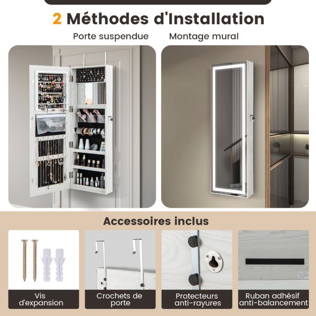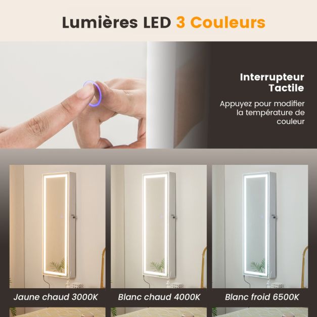 Armoire à bijoux avec ecran tactile lumineux led verrouillable rangement pour bijoux et cosmétiques 120 cm blanc 20_0007705