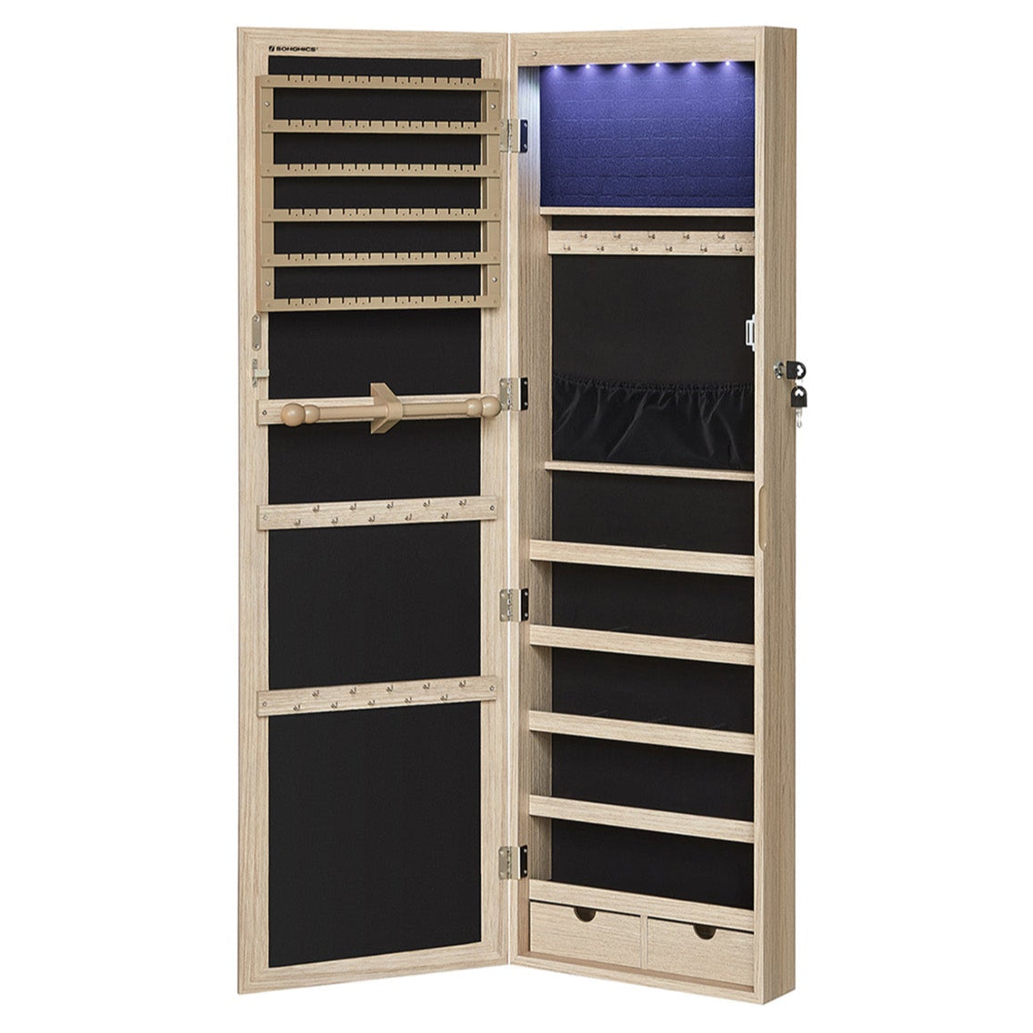 À l’intérieur, tout a sa place : 84 emplacements pour bagues, 90 fentes pour boucles d’oreilles, 48 trous pour clous, 32 crochets pour colliers, 5 étagères, 2 tiroirs et 1 barre pour bracelets. Vous pouvez y ranger non seulement vos bijoux, mais aussi vos cosmétiques, parfums et petits accessoires.