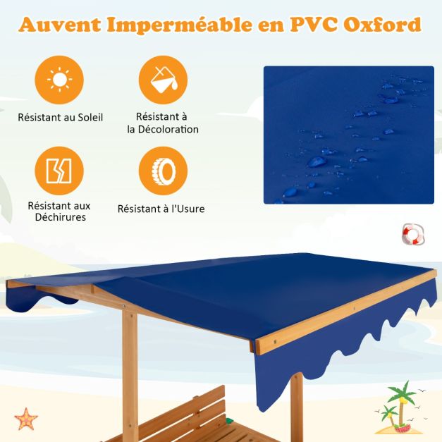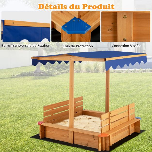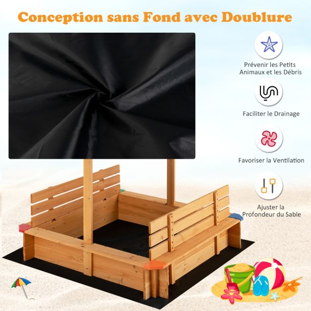 Bac à sable en bois de sapin avec toit et 2 bancs amovibles bac à sable avec conception sans fond & doublure charge 60 kg pour 3 ans+ 20_0007743