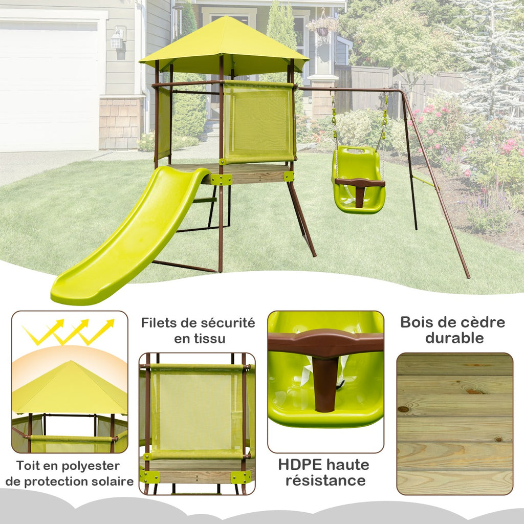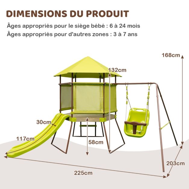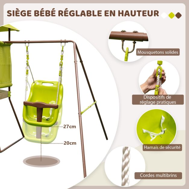 Portique de balançoire 4 en 1 pour enfants aire de jeu en métal avec cabane couverte siège bébé réglable en hauteur toboggan & échelle vert 20_0009115
