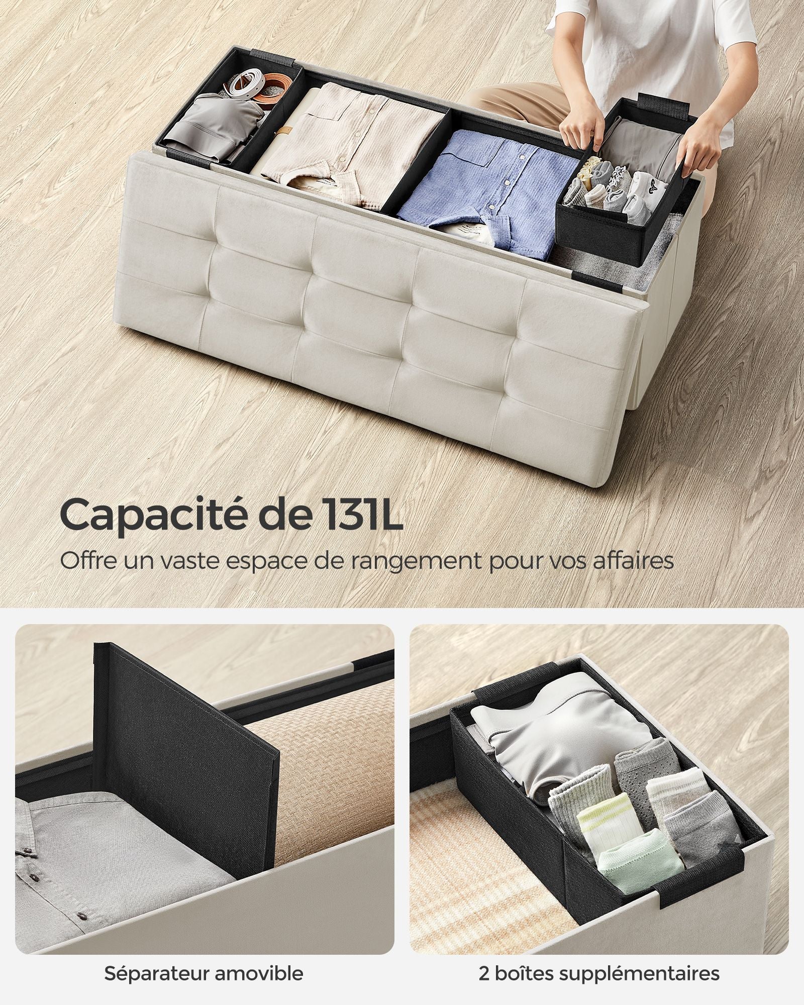 Avec ses dimensions de 38 x 110 x 38 cm, ce banc offre une capacité de 131 L pour ranger livres, couvertures et autres affaires. Les deux boîtes de rangement sont parfaites pour les petits objets et le séparateur amovible permet un rangement organisé par catégorie.