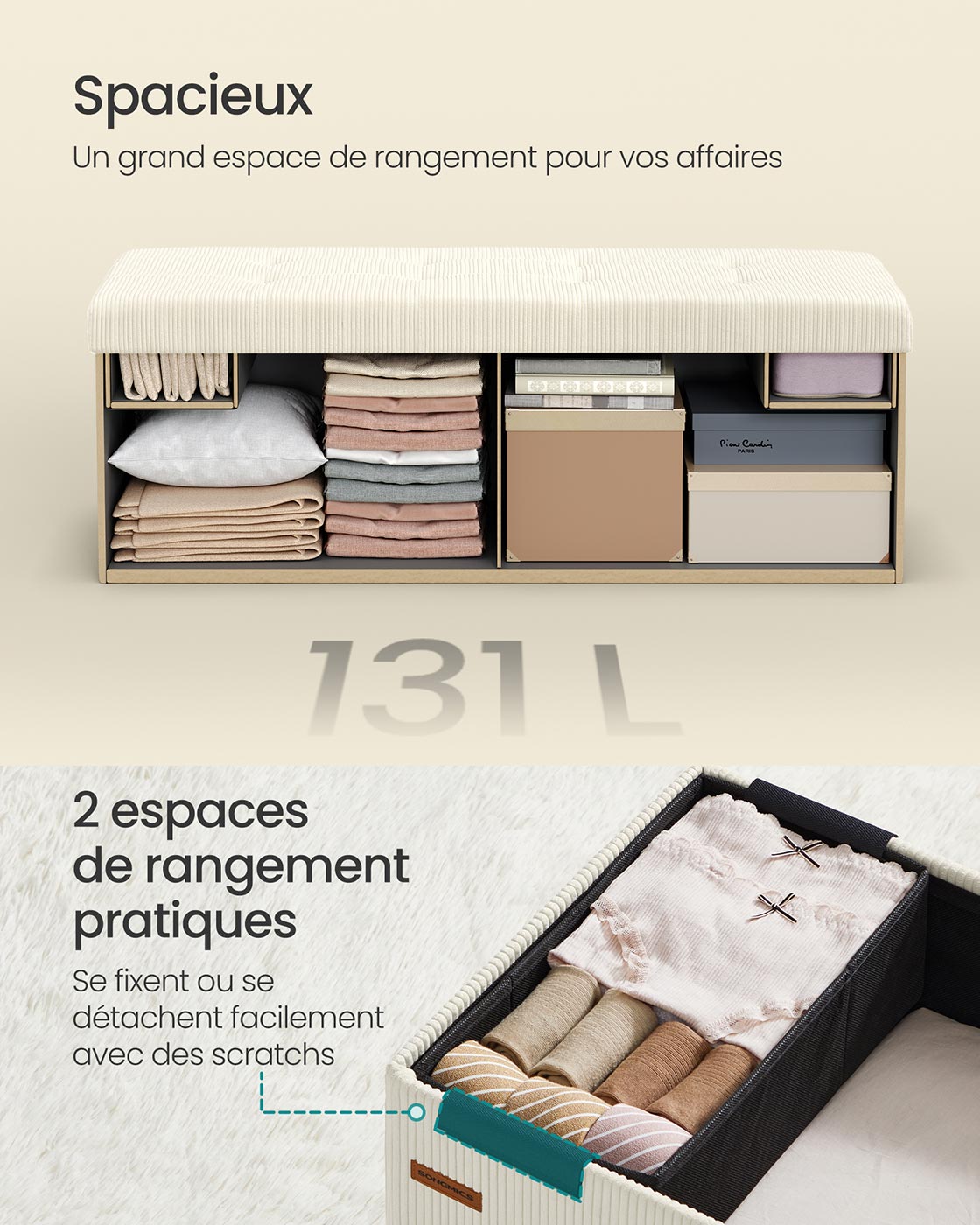 Avec ses dimensions de 38 x 110 x 38 cm, il offre un volume généreux de 131 L pour organiser livres, couvertures et divers objets. Deux boîtes de rangement pratiques accueillent les petits articles, tandis qu’un séparateur amovible permet de classer vos affaires par catégorie.
