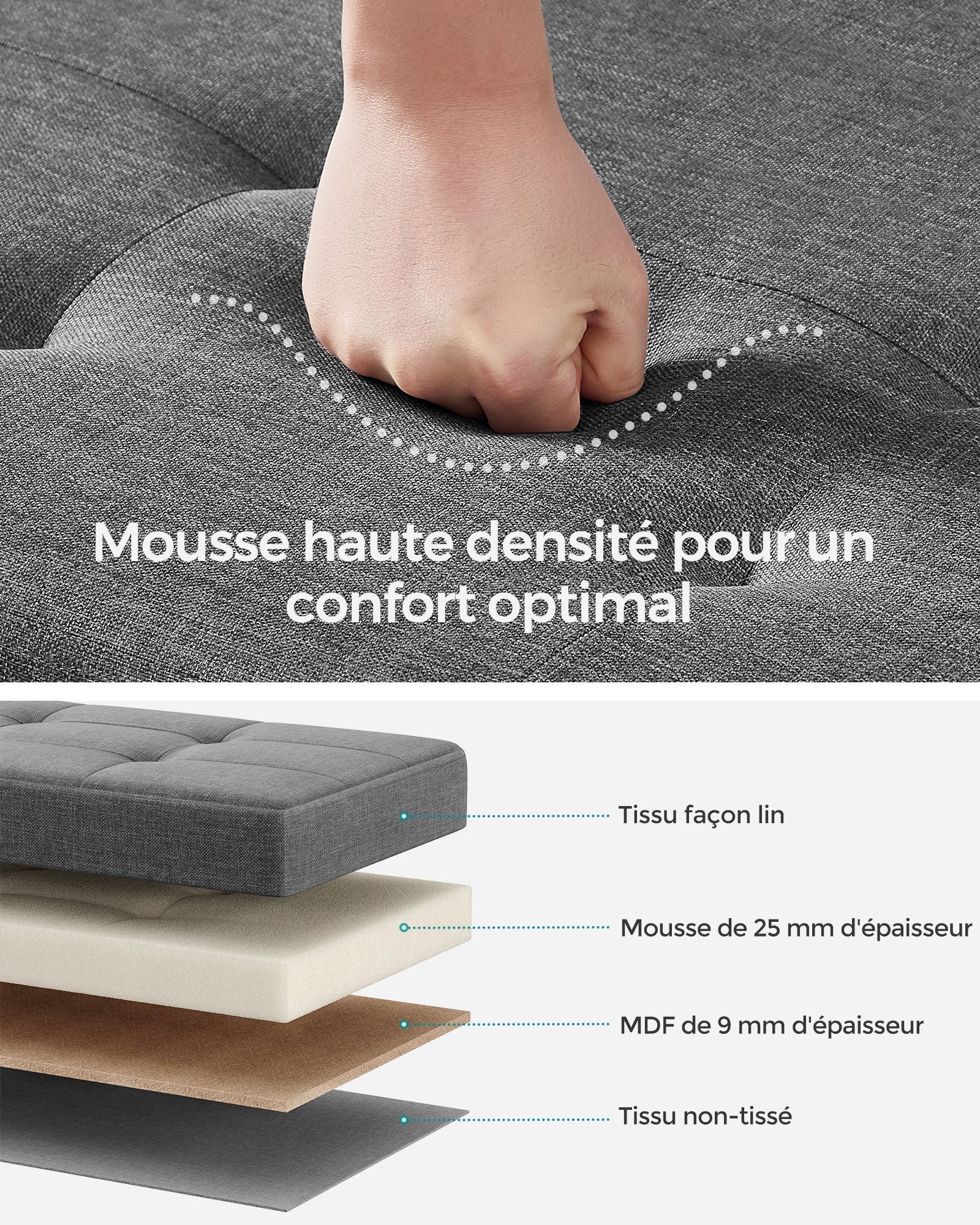 Matériaux : Panneau MDF, rembourrage en mousse, tissu façon lin