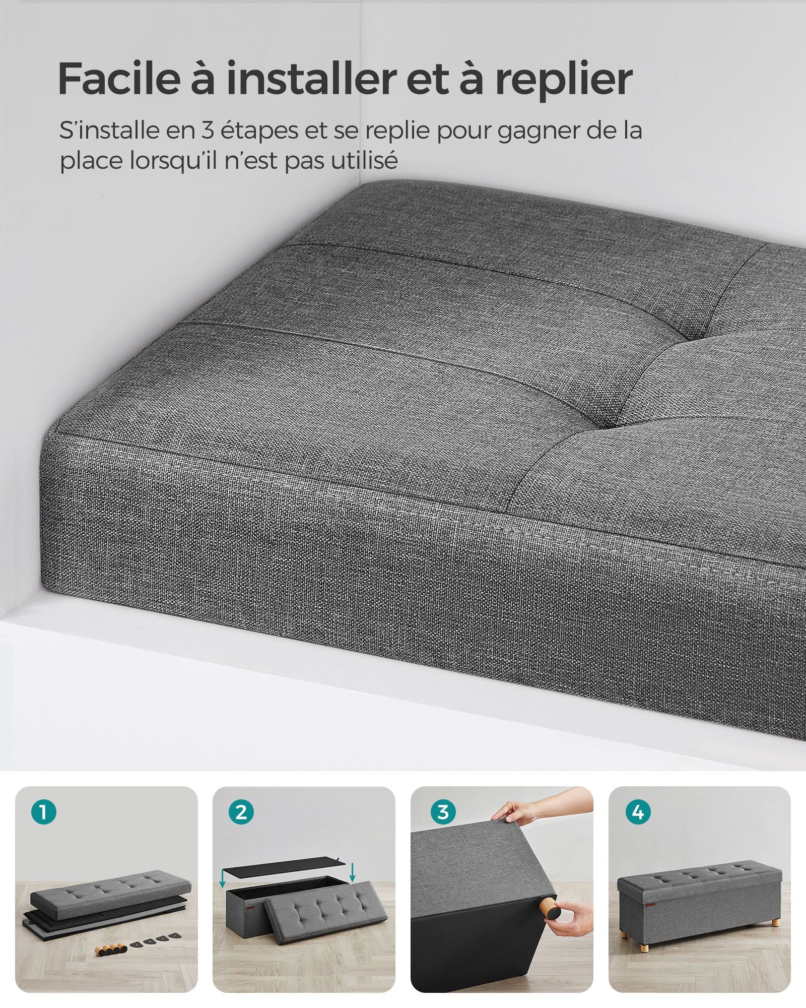 Polyvalent, ce banc pliant de 112 litres de capacité (38 x 110 x 40 cm) peut servir de repose-pieds, de table basse, de bout de lit ou encore de siège décoratif près d’une fenêtre, tout en offrant un espace de rangement spacieux.