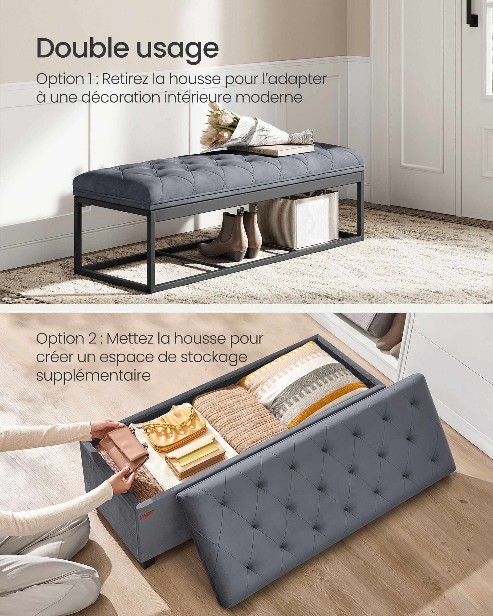 Ce modèle est également personnalisable : vous pouvez choisir de conserver la housse en velours pour accentuer son côté élégant, ou de la retirer afin d’obtenir un style plus épuré et moderne.