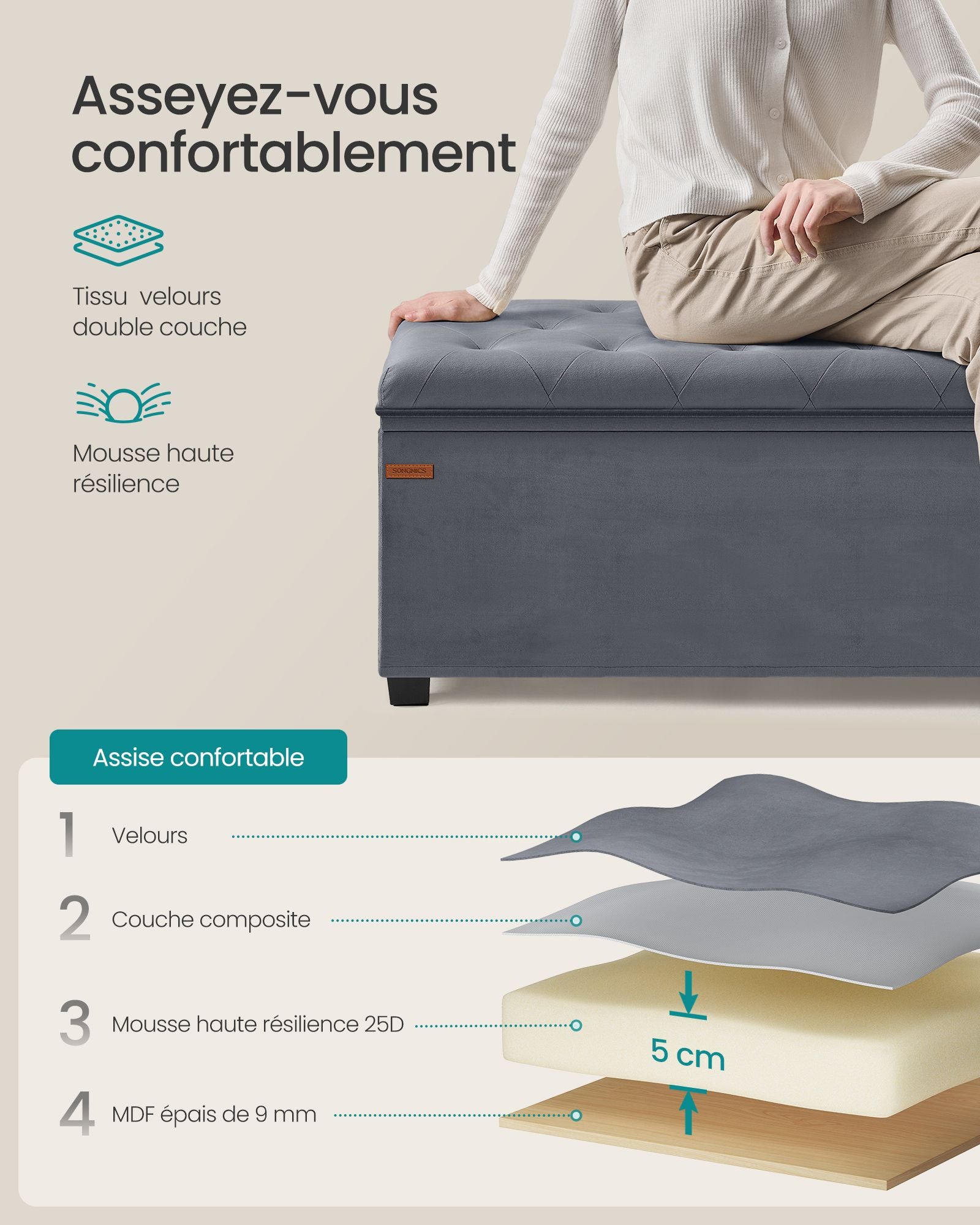Matériaux : Panneau MDF, velours, mousse haute résilience 25D