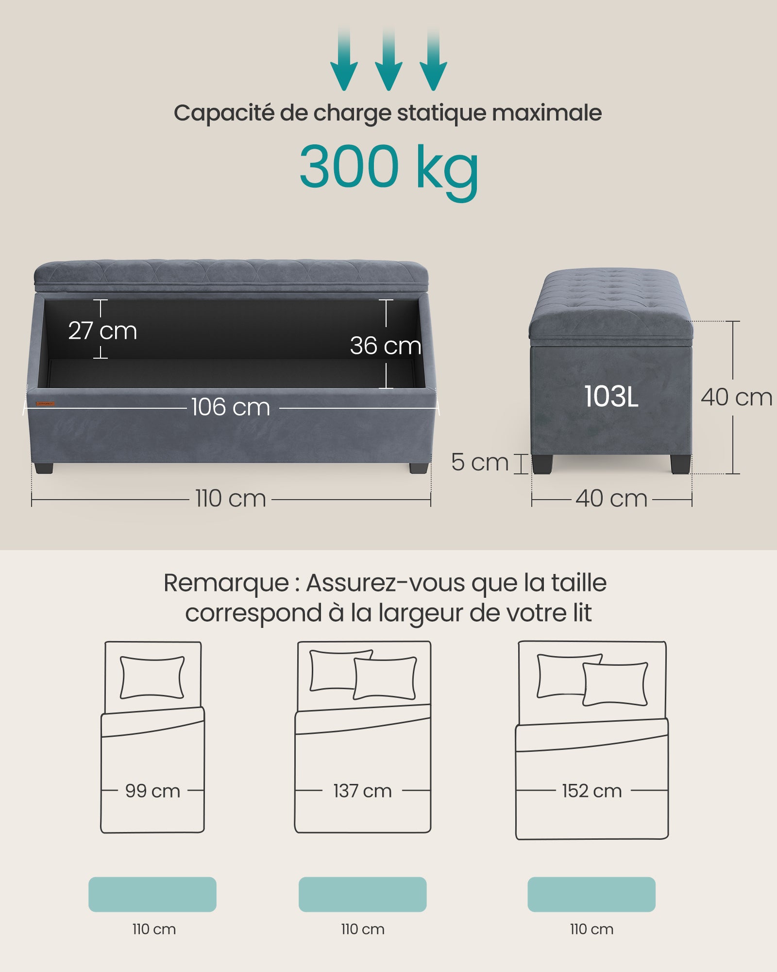 Avec ses dimensions de 40 x 110 x 40 cm, il propose un grand espace de rangement de 103 L, parfait pour accueillir couvertures, linge de lit, livres ou autres affaires.