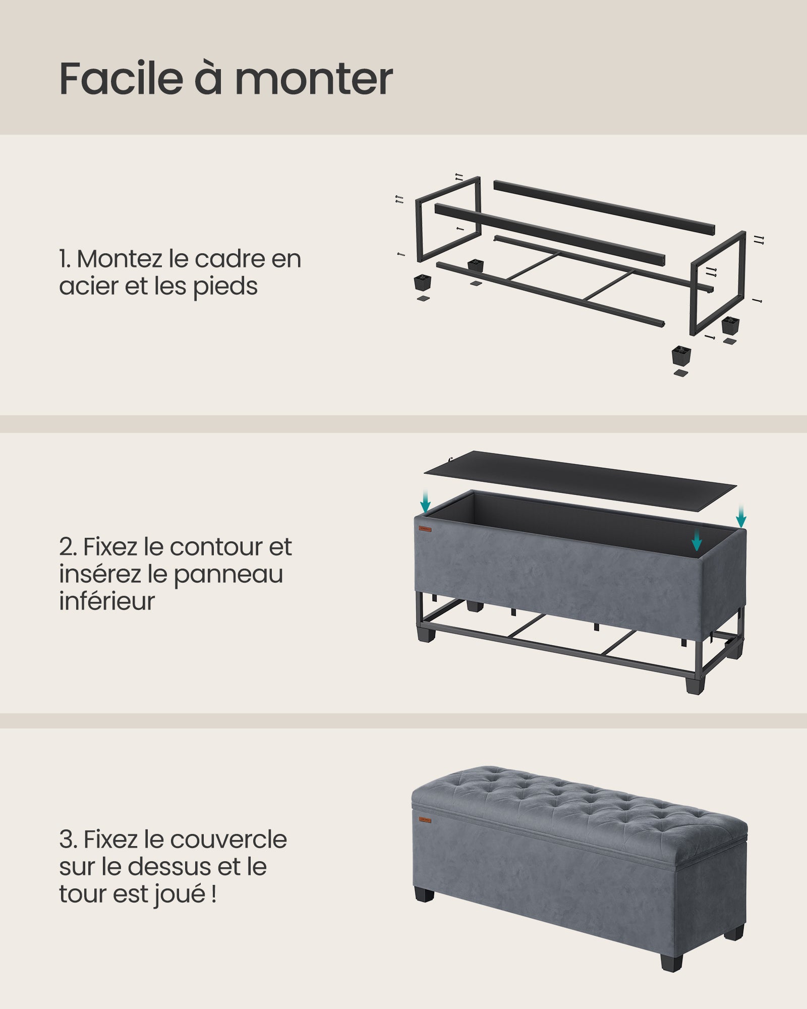 Conçu avec des panneaux MDF robustes et renforcé par des protections d’angle en métal sur le couvercle, ce banc de rangement offre une solidité remarquable. Il peut supporter jusqu’à 300 kg, vous garantissant ainsi une assise fiable et durable.