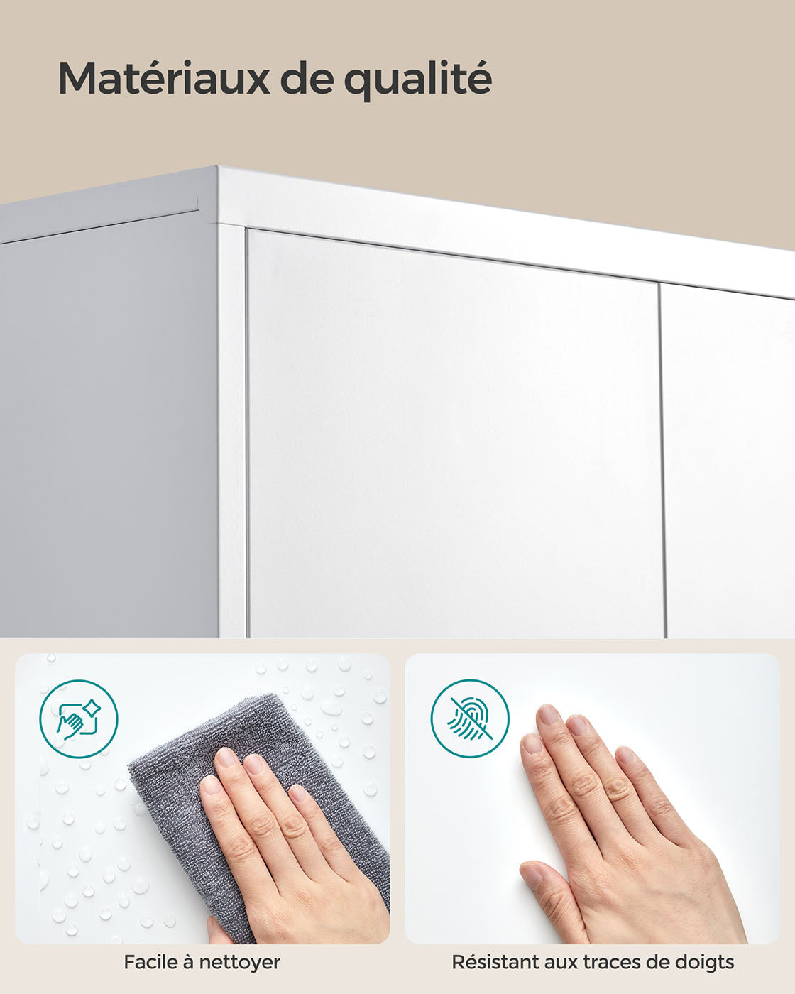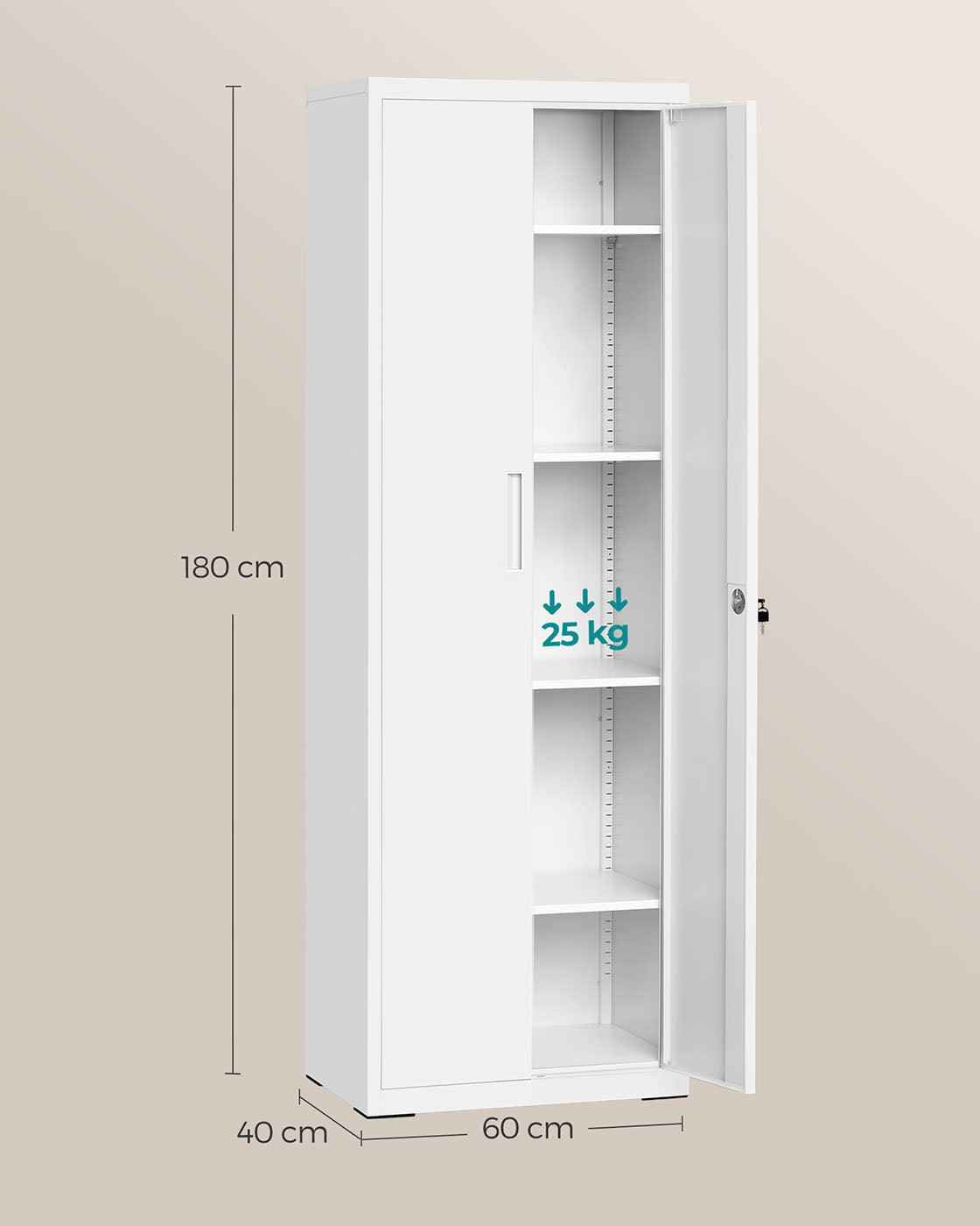 Fabriquée en acier de haute résistance, cette armoire de 40 x 60 x 180 cm est solide et durable. Chaque niveau supporte jusqu’à 25 kg, garantissant une grande capacité de charge pour un usage quotidien intensif.