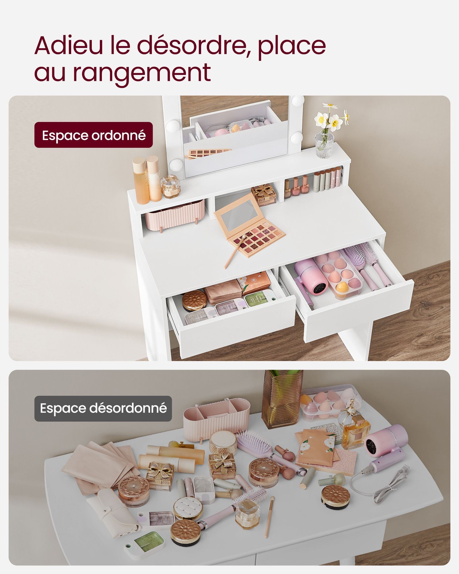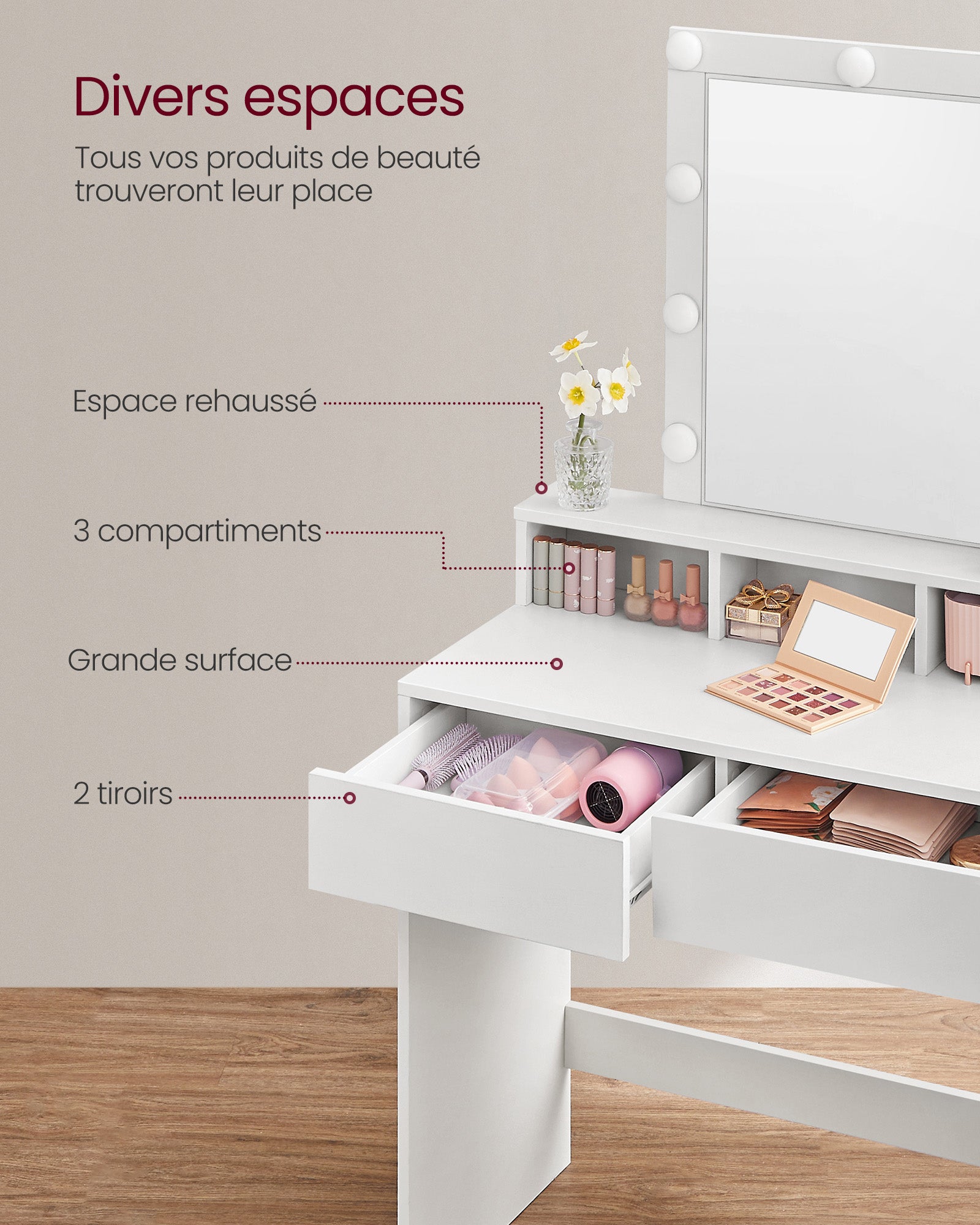 Tout a sa place : vos palettes et poudres se rangent dans les deux grands tiroirs, vos vernis trouvent leur espace dans les trois compartiments ouverts, tandis que vos parfums et accessoires peuvent être disposés sur le plateau supérieur. Chaque chose est bien organisée et facilement accessible.
