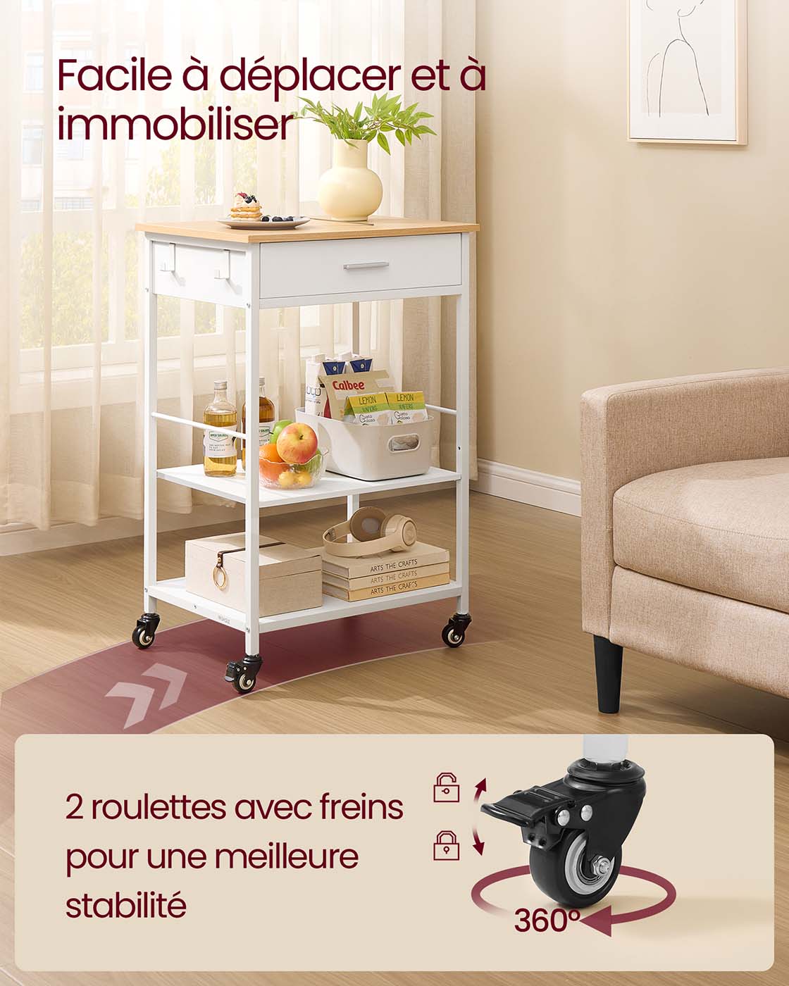 Pratique et polyvalente, cette desserte de cuisine mobile vous simplifie la vie au quotidien. Grâce à ses 4 roulettes pivotantes à 360°, dont 2 équipées de freins, vous pouvez la déplacer facilement selon vos besoins ou la bloquer en toute sécurité à l’endroit souhaité.