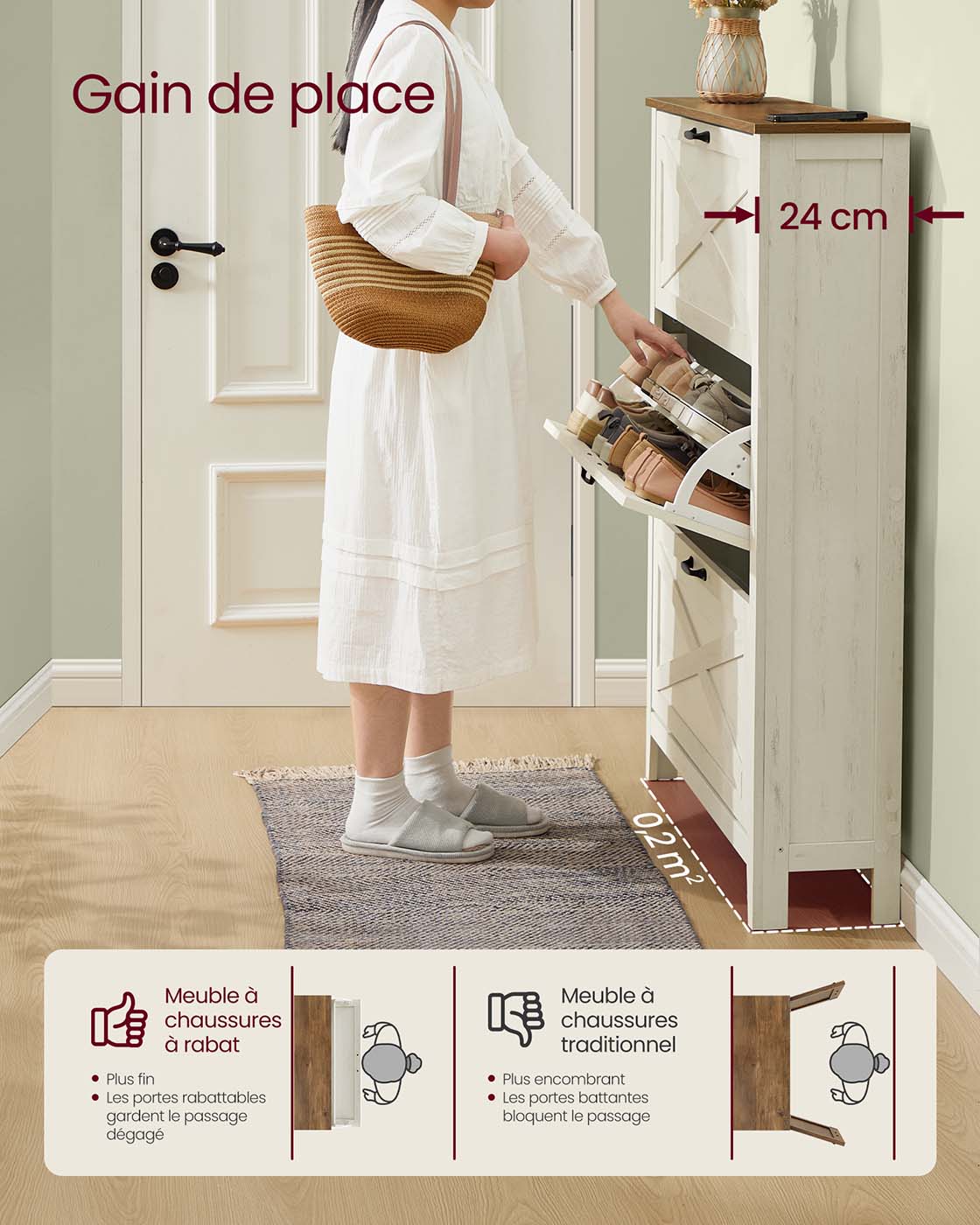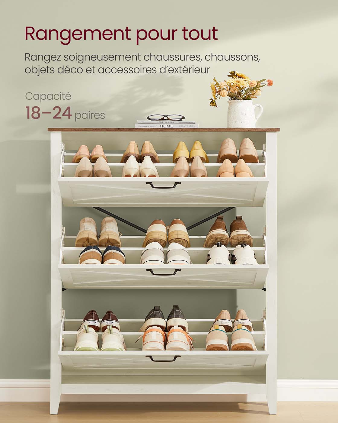 Meuble à chaussures à 3 abattants placard de rangement 24 x 87 x 123,6 cm autoportant étroit pour entrée style campagne capacité de 18 à 24 paires blanc rustique 12_0007993