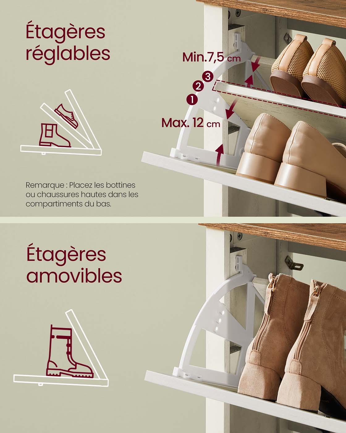 Grâce à ses tiroirs basculants et à son profil mince, elle s’intègre facilement dans les petits espaces. Vous pouvez ainsi accéder à vos chaussures rapidement sans encombrer le passage.