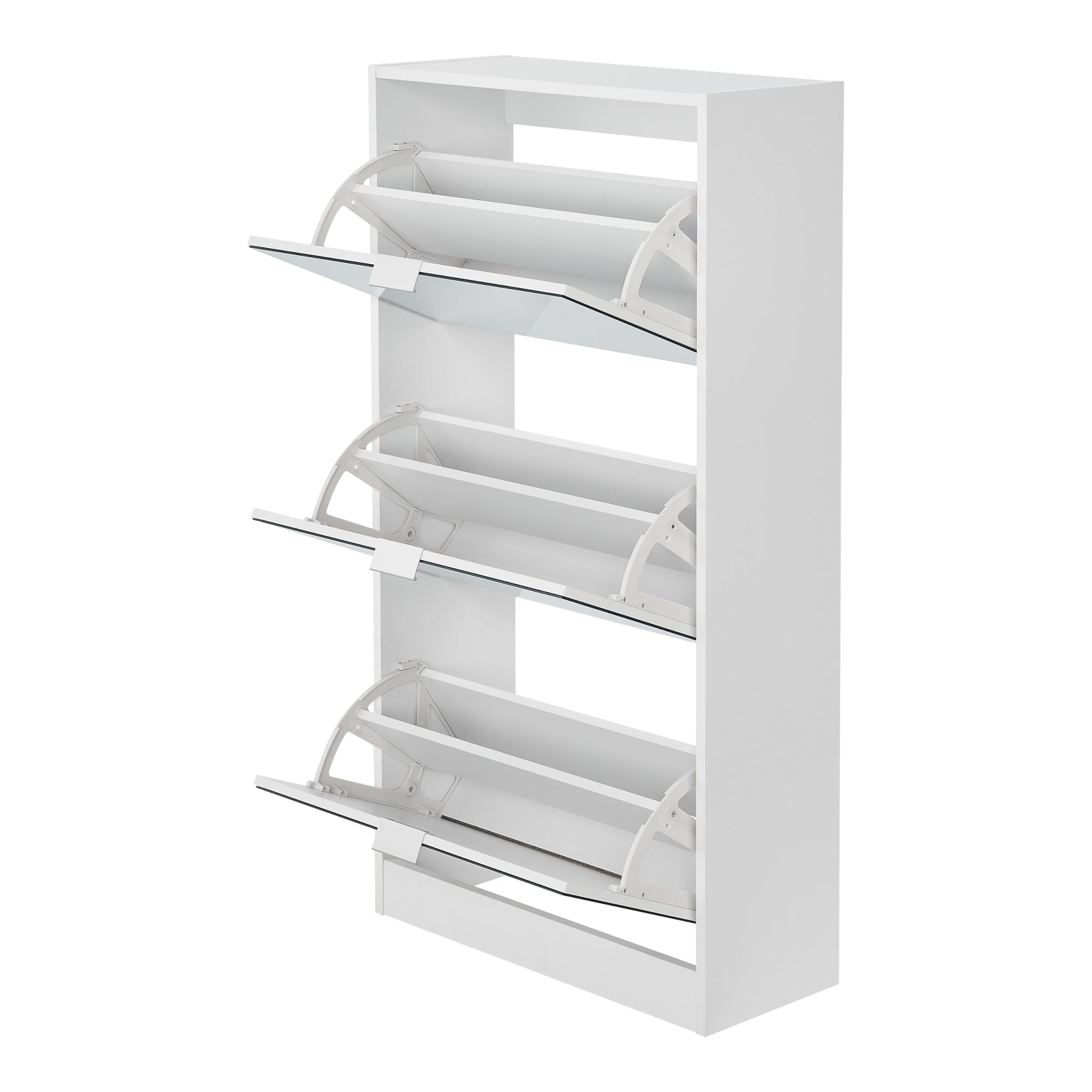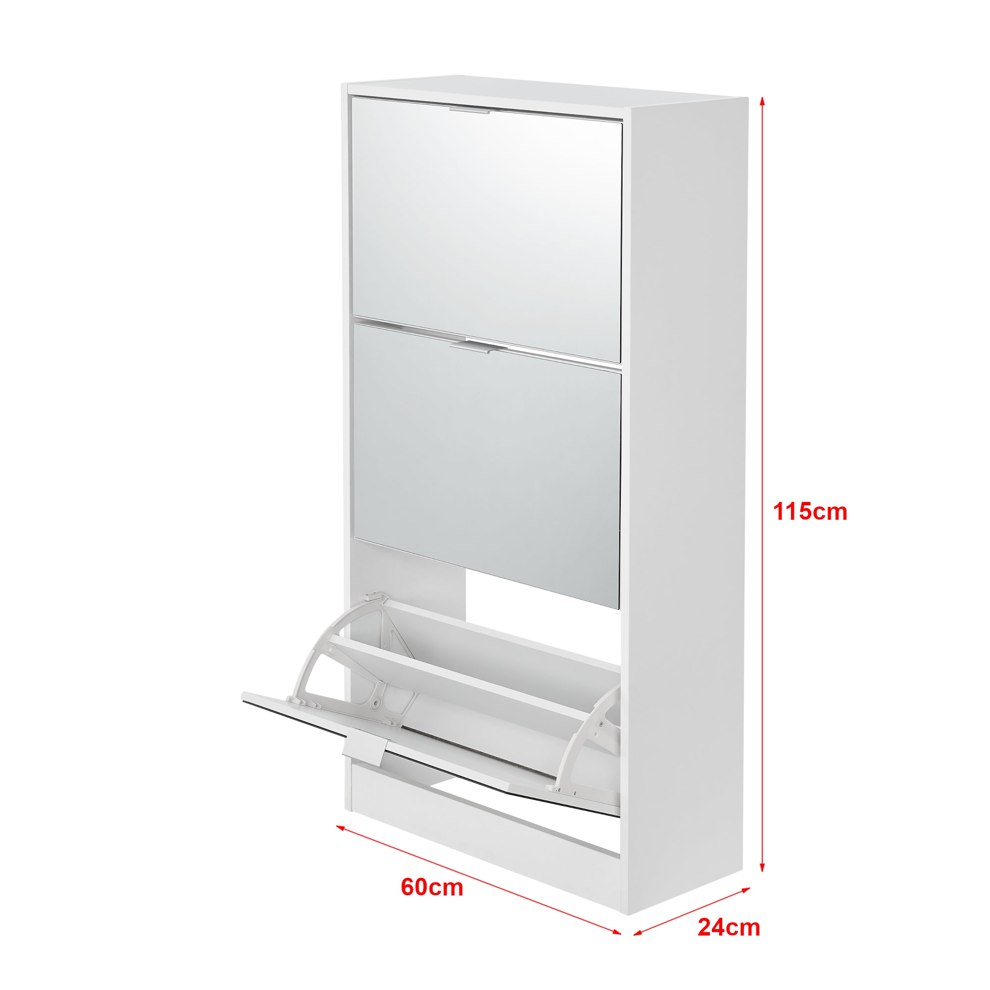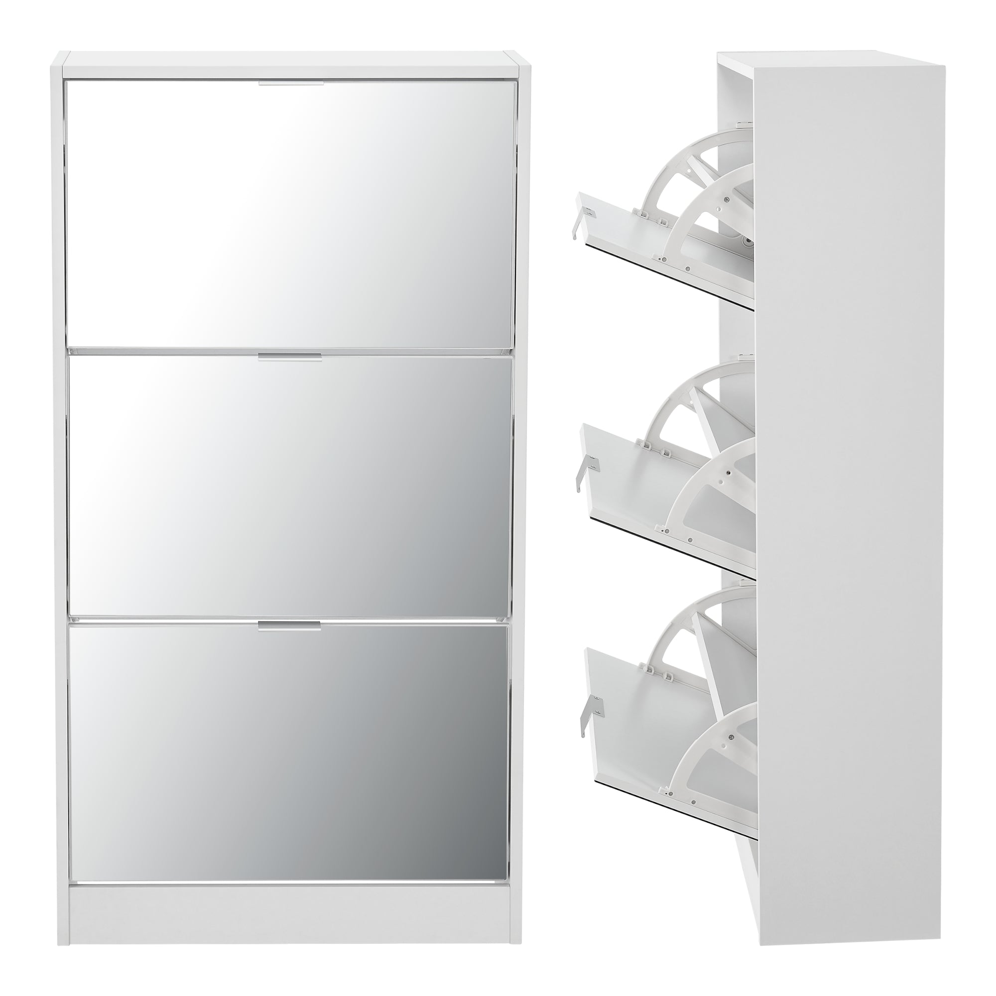 Notre armoire à chaussures, à la fois pratique et élégante, vous aidera à garder votre entrée bien organisée. Ses tiroirs inclinés, équipés de miroirs, agrandissent votre pièce et vous offrent la possibilité de jeter un dernier coup d'œil dans le miroir avant de partir.