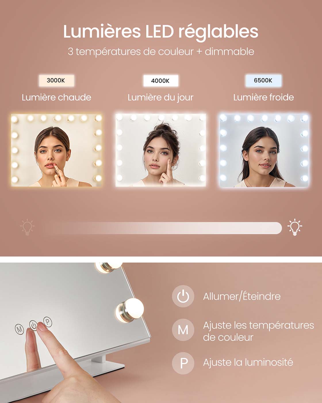 Ce miroir de coiffeuse avec lumières LED offre un rendu fidèle pour votre maquillage grâce à ses 3 températures de couleur et sa luminosité réglable selon vos besoins. Ses boutons tactiles restent éteints lorsqu’ils ne sont pas utilisés, pour ne pas perturber votre sommeil la nuit.