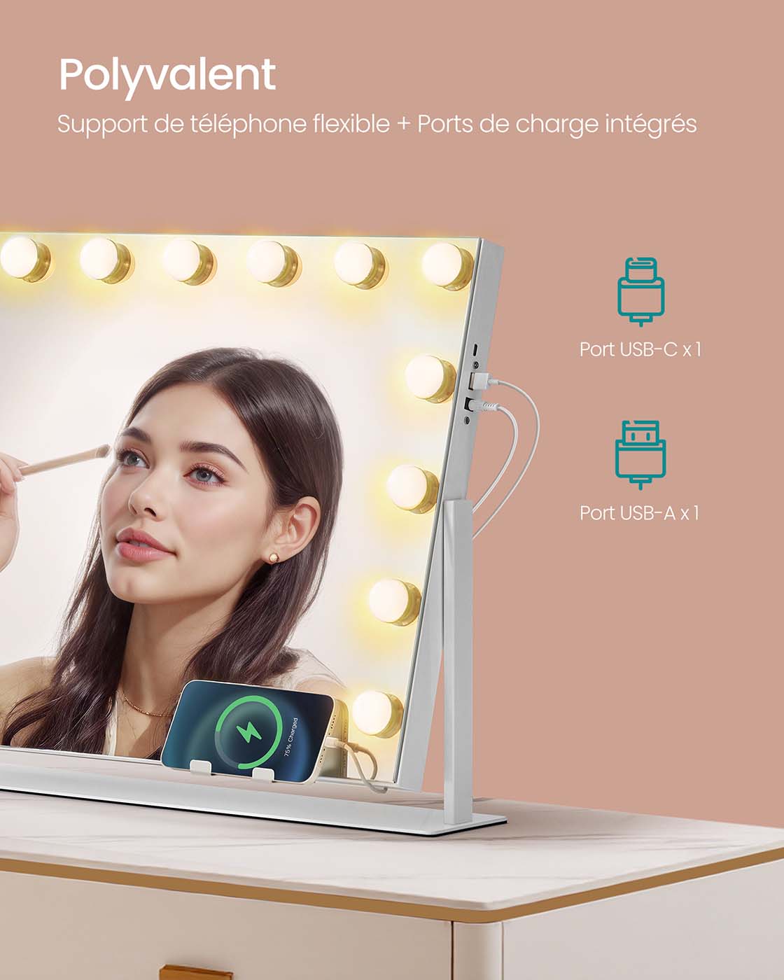 Pratique, il dispose d’un support de téléphone intégré, installable à gauche comme à droite, qui accueille la plupart des smartphones et tablettes. De plus, un port USB-A et un port USB-C vous permettent de recharger vos appareils directement pendant votre routine beauté.