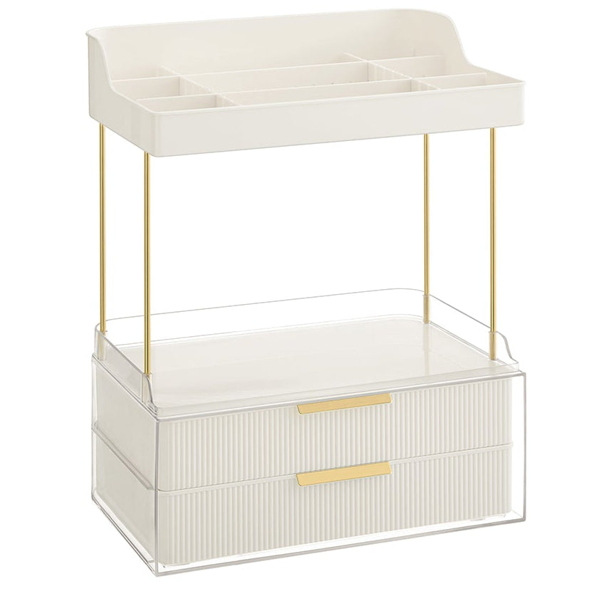 Pensé pour une utilisation conviviale, le fond antidérapant des niveaux supérieur et intermédiaire maintient vos cosmétiques en place. Quant aux 2 tiroirs avec poignées, ils permettent d’accéder facilement à vos petits objets.