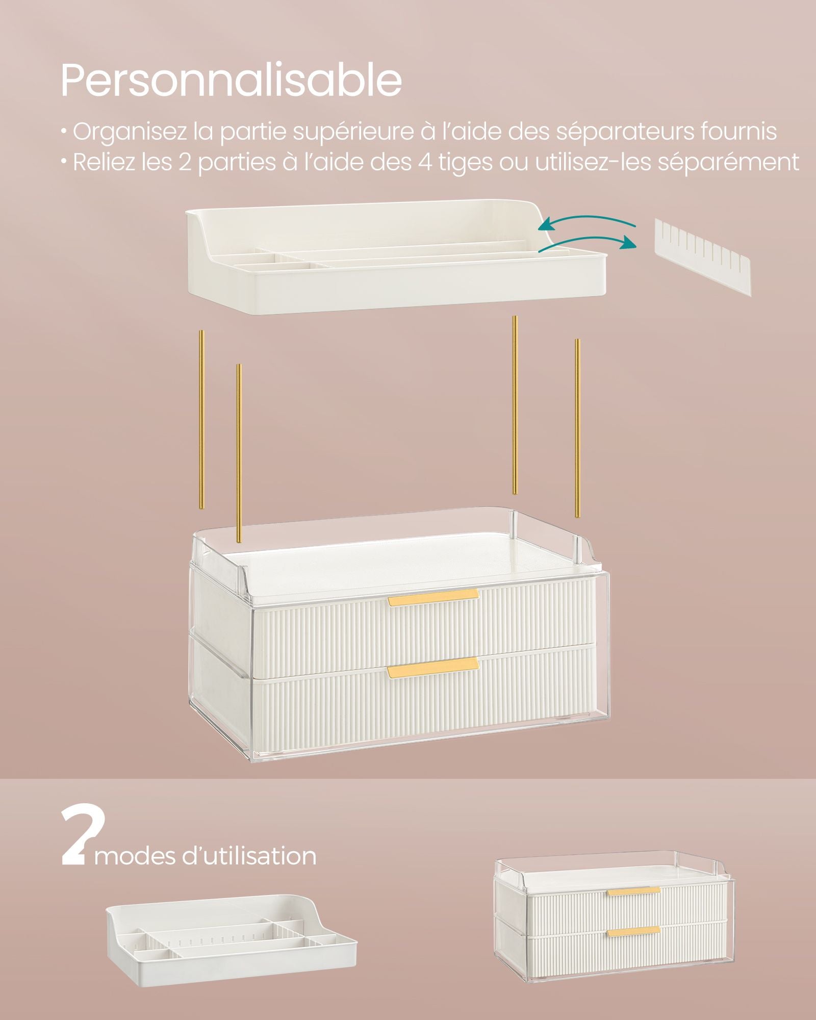 Le rangement est personnalisable : les séparateurs fournis vous permettent d’adapter l’organisation de l’étagère supérieure selon vos besoins. Vous pouvez aussi choisir d’empiler les deux parties pour gagner de la place ou de les utiliser séparément pour plus de flexibilité.